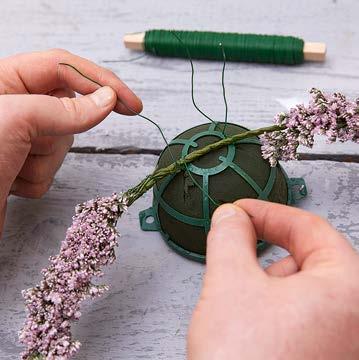 Den Pinholder mithilfe von Oasis Fix auf dem Schalenboden befestigen. Steckschaum wässern und in die gewünschte Größe schneiden. Diesen anschließend mit Kräutern und Pflanzengrün umwickeln, dabei mit Schnur fixieren. Steckschaum auf dem Pinholder in der Schale befestigen und oben mit Floralien ausstecken. Bei der Variante mit der Kerze den Kerzenhalter einsetzen und die Kerze darin einstellen.