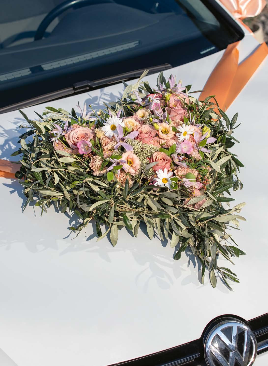 Den Wellendrahtring locker mit Olivenlaub mithilfe des Wickeldrahts bewickeln. Den Steckschaum wässern, Steckdrähte mit Flower Tape umwickeln und am Olivenkranz befestigen. Nun den Olivenkranz am Kunststoffgitter der Steckunterlage fixieren und die restlichen Floralien einstecken. Das Werkstück mithilfe des integrierten Vakuumsaugers auf der Motorhaube des Hochzeitsautos befestigen. Bzgl. der Höhe unbedingt darauf achten, dass die Sicht des/der FahrerIn nicht behindert wird!