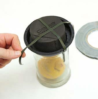 Damit die Steckschaumschale gut auf dem Glasgefäßpodest hält, sollte sie mittels Anchor Tape darauf fixiert werden.