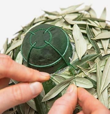 Steckschaumbereich des Brautstraußhalters wässern. Dann Ring aus Pappe schneiden und zu einer Manschette zusammentackern. Manschette mit doppelseitigem Klebeband bekleben, Olivenblätter dicht an dicht und ggf. mehrlagig aufkleben. Wollfilz auf die Unterseite kleben. Manschette mit Wickeldraht am Kunststoffgitter vom Brautstraußhalter befestigen und weitere Olivenblätter mit Floral Adhesive aufkleben. Die Blüten einfügen und für den besseren Tragekomfort den Griff vom Brautstraußhalter mit Schnur umwickeln.