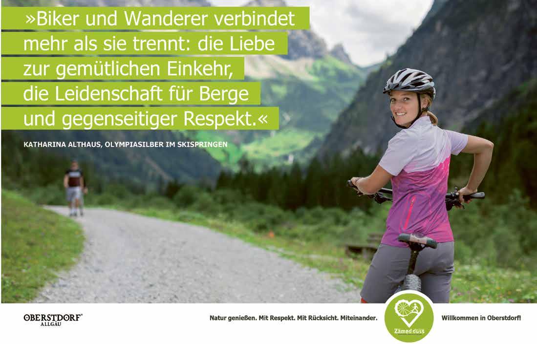 Erlebnisdorf Oberstdorf verbindet faszinierende Sportart mit zwei großartigen anlagen 4 Endlich Sommer 7 Badespaß in Oberstdorf: auf ins kühle nass! 8 Das Moorbad in Oberstdorf 9 Aktivdorf Grenzstein 147 – die südlichste Stelle Deutschlands 10 Gemeinsam auf dem Weg zur grünen Zukunft 12 Zämed duss – Die Rad- und Wandersaison beginnt 13 alpin Info mit Bergsportbericht / lokale Erzeugnisse 14 Wir packen unseren Rucksack und nehmen mit ... 15 Gästeprogramm vom 03. Juli bis 30. Juli 2023 16 Buchbare Erlebnisse 21 Kinder- und Ferienprogramm 23 Veranstaltungen Veranstaltungskalender vom 30. Juni bis 31. Juli 2023 26 Gottesdienste und kirchliche Veranstaltungen 32 11. Oberstdorfer Fotogipfel 34 23. nebelhorn Berglauf am 02. Juli 2023 35 Open-air-Festival – Kultur im Park 36 30 Jahre Oberstdorfer Musiksommer 2023 37 Die Geschichte der Bergwacht Oberstdorf 38 Kulturdorf Der Wilde Mändle tanz 40 Besondere Gottesdienste in der Evangelischen Christuskirche 41 Singen verleiht der Seele Flügel 41 Ranking & Profifoto new talent award 42 the teardrop Exploses 43 Familientreffen – atemberaubende Bilder 43 Damals ... vor 125 Jahren 44 Vitaldorf Die highlights der neuen therme Oberstdorf 45 Oberstdorf zum Wohlfühlen 46 Vom gesunden leben und naturgemäßen heilen 47 Kaiserschmarrn - Rezept 48 fab.coffee - Die Kaffeerösterei aus Oberstdorf 48 Glas auf, Urlaub an 49 Oberstdorf Bus Inklusive 50 Pumptrack Oberstdorf im nordic Zentrum 52 Bequem Radeln und nachhaltig laden 53 Gemeinsam für ein sauberes allgäu 53 Oberstdorf für unterwegs 54 Kleine Schritte, große Wirkung 56 Die Ehrentafel / Der Medaillenspiegel 57 Für unsere Ehrengäste 57 Notizen Bibliothek / Barrierefreie Beratung bei tourismus Oberstdorf / hundetoiletten und tütenspender 58 A bis Z Oberstdorfer anbieter 59