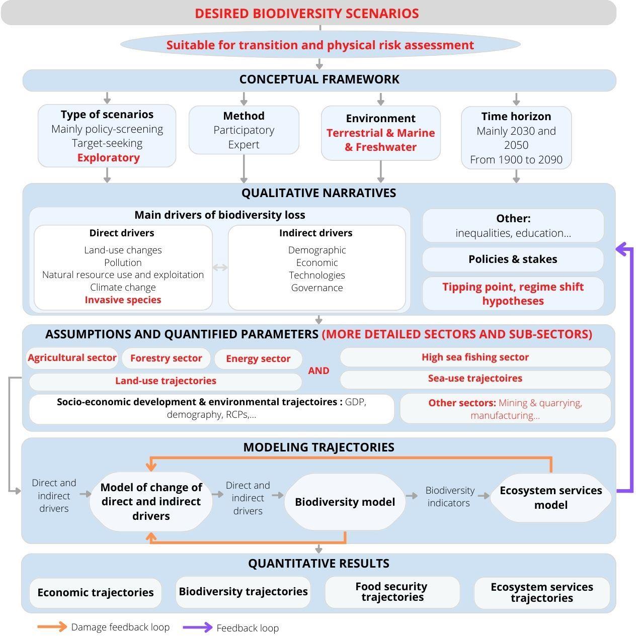 However, unlessappropriate biodiversityscenariosare foundtobuildaforwardlookingassessmentofthe consequences ofphysicaland transitionshocks onindustries andsectors,meaningful inclusionofNature-Related FinancialRisks(NRFRs)cannot seethe lightofday.This paper aimstoreviewandcompare existingquantitative biodiversityscenariosand models onaglobalscale that couldhelpfulfill thisrole. Italso offers anassessmentofthe pathforwardfor researchto developingscenariosforBRFRs ateachstepofthe process: frombuildingnarratives, quantifyingtheimpactsand dependencies, assessingthe uncertaintyrangeonthe resultsallthewayfromthe ecosystemtotheeconomic andfinancial asset.