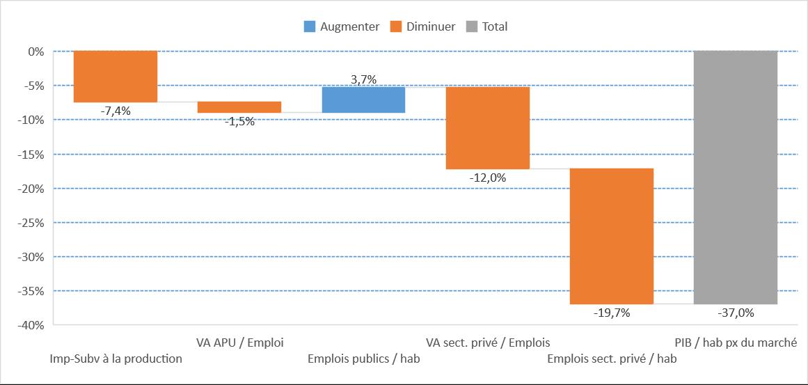 Le PIB au prix du marché est étudié à partir de ses trois composantes : la valeur ajoutée du secteur public, estimée a minima par la valeur ajoutée de la branche des administrations publiques, la valeur ajoutée du secteur privé, estimée à partir de la valeur ajoutée des autres branches, et l’agrégat Impôts à la production – Subventions à la production. Les composantes publique et privée du PIB sont rapportées à la somme des valeurs joutées, c’est-à-dire au PIB au coût des facteurs.