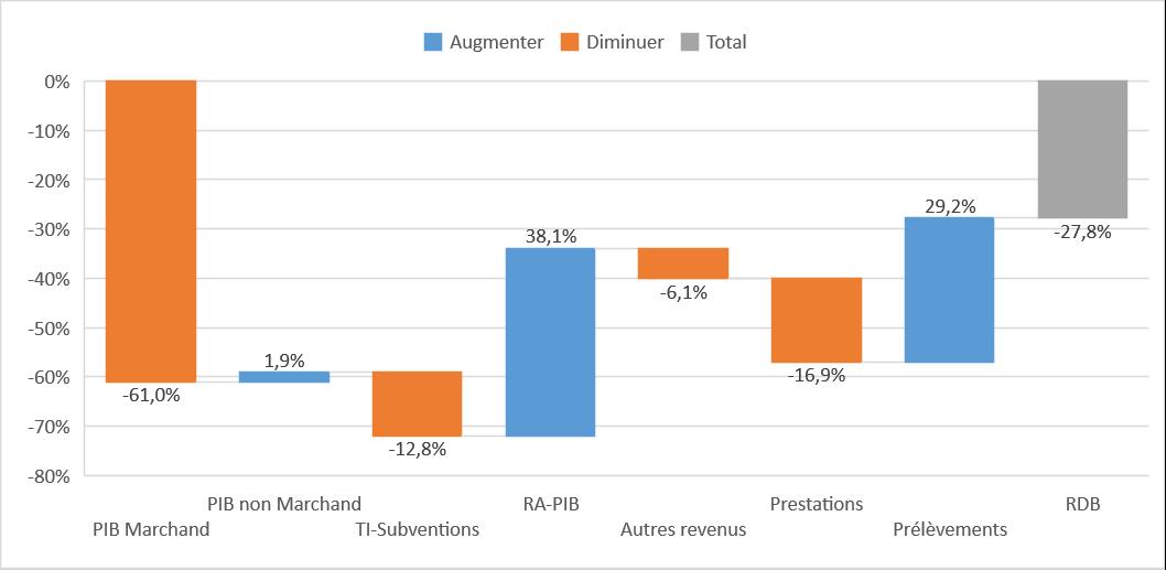 Pour rapprocher les contributions à la réduction des écarts des composantes du PIB et des composantes du RDB ci-dessus, on recourt à la décomposition du revenu d’activité en deux termes : le PIB et l’écart entre le revenu d’activité et le PIB, RA-PIB, qui rend compte du partage du PIB au prix du marché entre les revenus d’activité des ménages et l’EBE des entreprises.