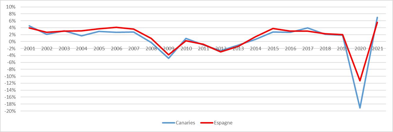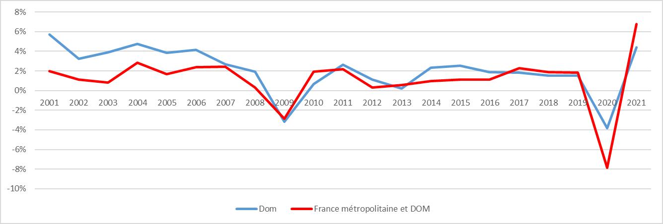 Enfin, au cours de ces deux dernières décennies, le modèle de développement des DOM, plus dépendant des transferts publics que celui qui prévaut dans les autres régions ultrapériphériques, s’est avéré plus résilient aux crises économiques et il s’est traduit par de meilleures évolutions de l’activité et des revenus.