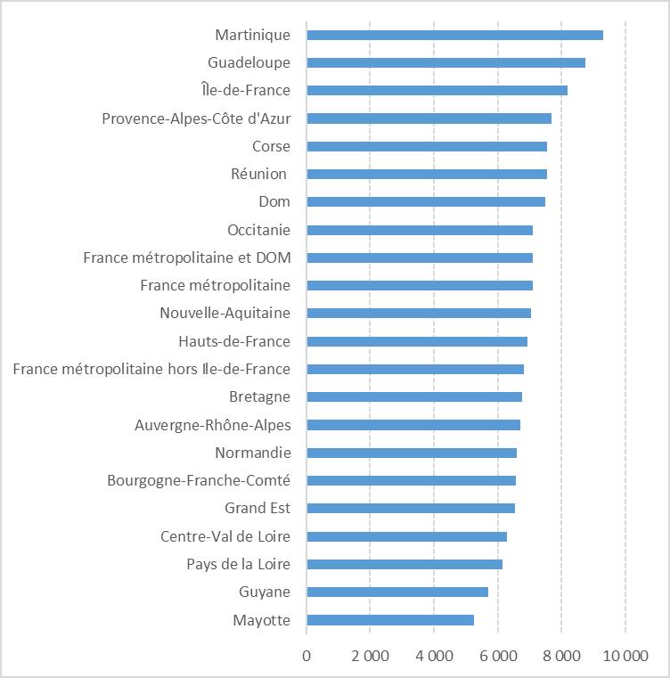 The economic catch-up of the overseas departments vis-à-vis France is even more marked in terms of gross household disposable income. This can also be explained by the large share of earned income from the public sector, but also by income redistribution policies. Indeed, even if the social benefits per inhabitant are on average lower in the overseas territories, this difference is largely compensated by much lower tax levies and social contributions.