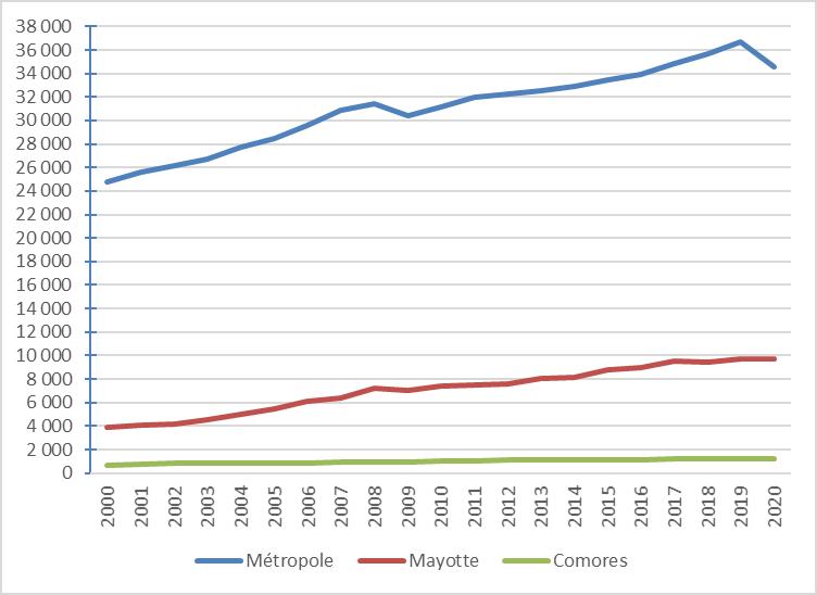 En revanche, au regard de l’évolution des Comores, les progrès sont spectaculaires, au point de contribuer à un phénomène d’attraction migratoire difficilement contrôlable : considérée avant l’indépendance des Comores comme l’une des iles les moins développées de l’archipel, le PIB par habitant de Mayotte, au mieux égal en 1975 au moment de l’indépendance avec celui des Comores, devient environ 5 fois plus élevé au début des années 2000 lorsqu’il avait été estimé dans le cadre de travaux du partenariat CEROM et environ 8 à 10 fois plus élevé en 2020.