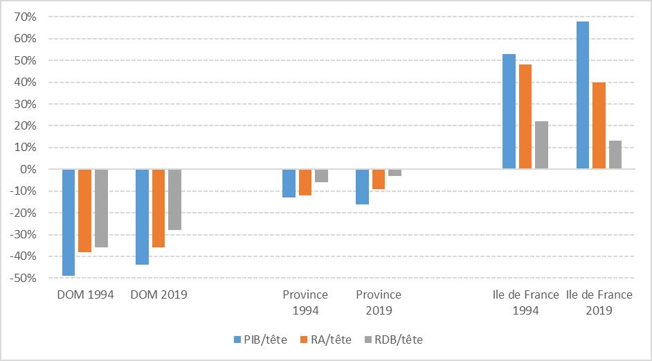 Les indicateurs retenus, le PIB et le RDB par habitant sont ceux utilisés dans le débat public. Ils présentent l’intérêt de permettre des comparaisons inter-régionales ou inter-RUP sur des périodes assez longues, même s’ils ne sont pas toujours les plus pertinents : ainsi serait-il préférable de suivre les inégalités de revenus en suivant les revenus par unité de consommation que les revenus par habitant ; de même il serait sans doute plus satisfaisant de rapporter le PIB à la population active plutôt qu’à l’ensemble de la population.