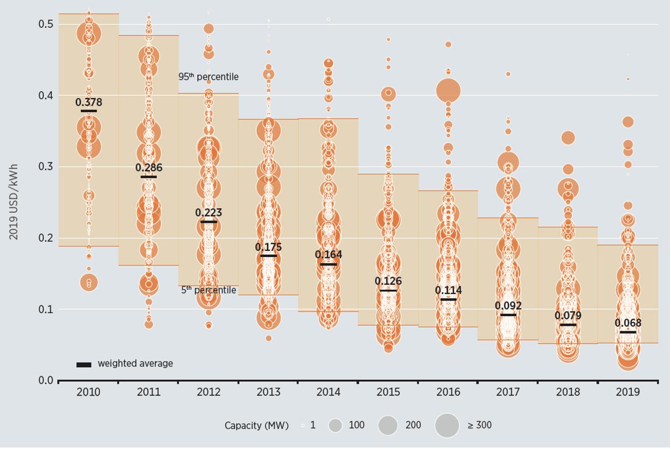 Même si l’Asie, l’Amérique du Nord et l’Europe resteront les marchés dominants aux horizons de 2030 et de 2050, la croissance serait la plus forte en Afrique selon les estimations de l’IRENA, avec 131 GW installés en 2030 (+1 500 % entre 2018 et 2030, contre +140 % pour l’Europe et +560 % pour l’Asie) 7. La capacité installée totale pourrait alors atteindre 673 GW en 2050 8 .