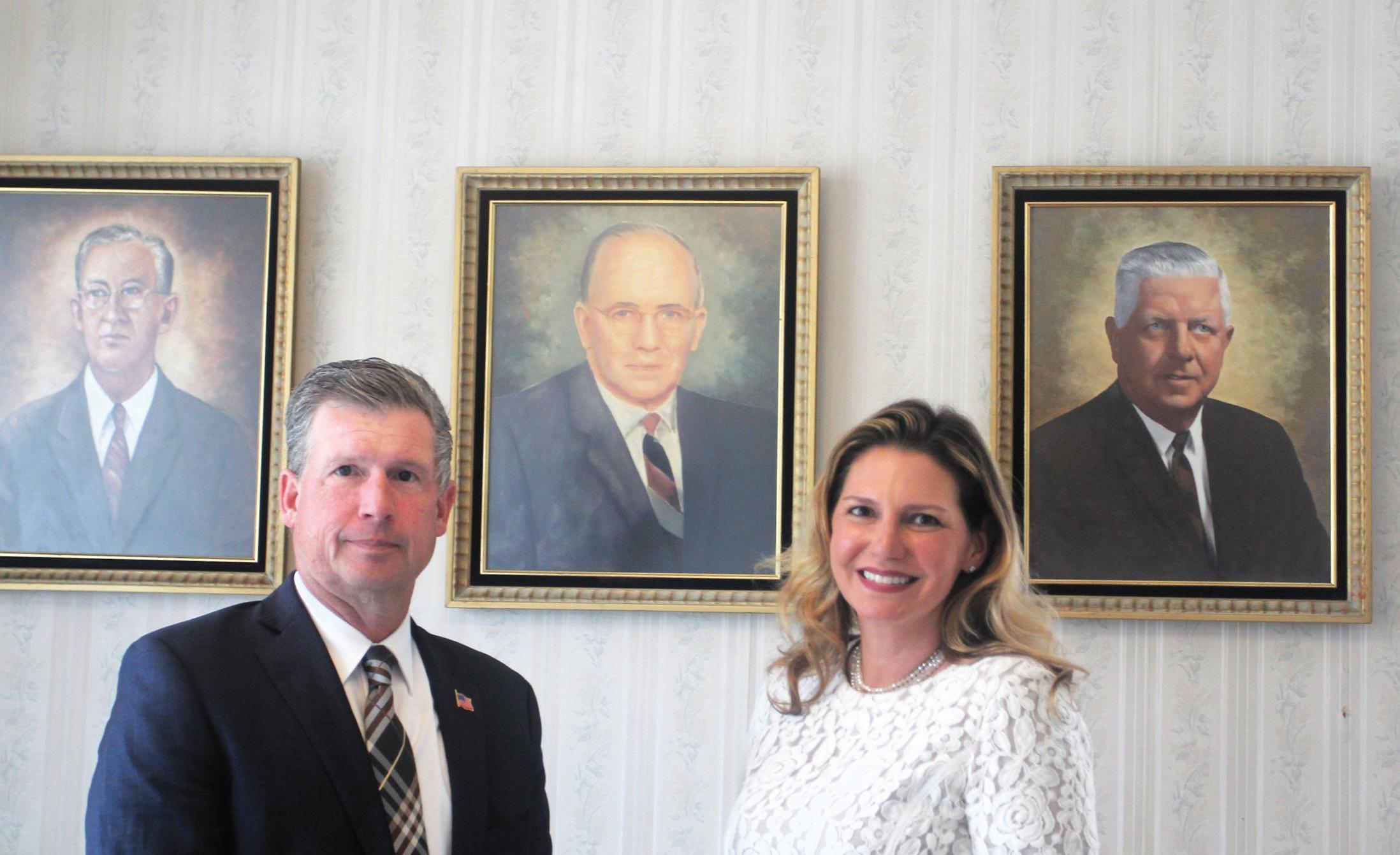 Jason Schultz and Robyn standing in the office. The portrait on the right is of John B. Greenlee.