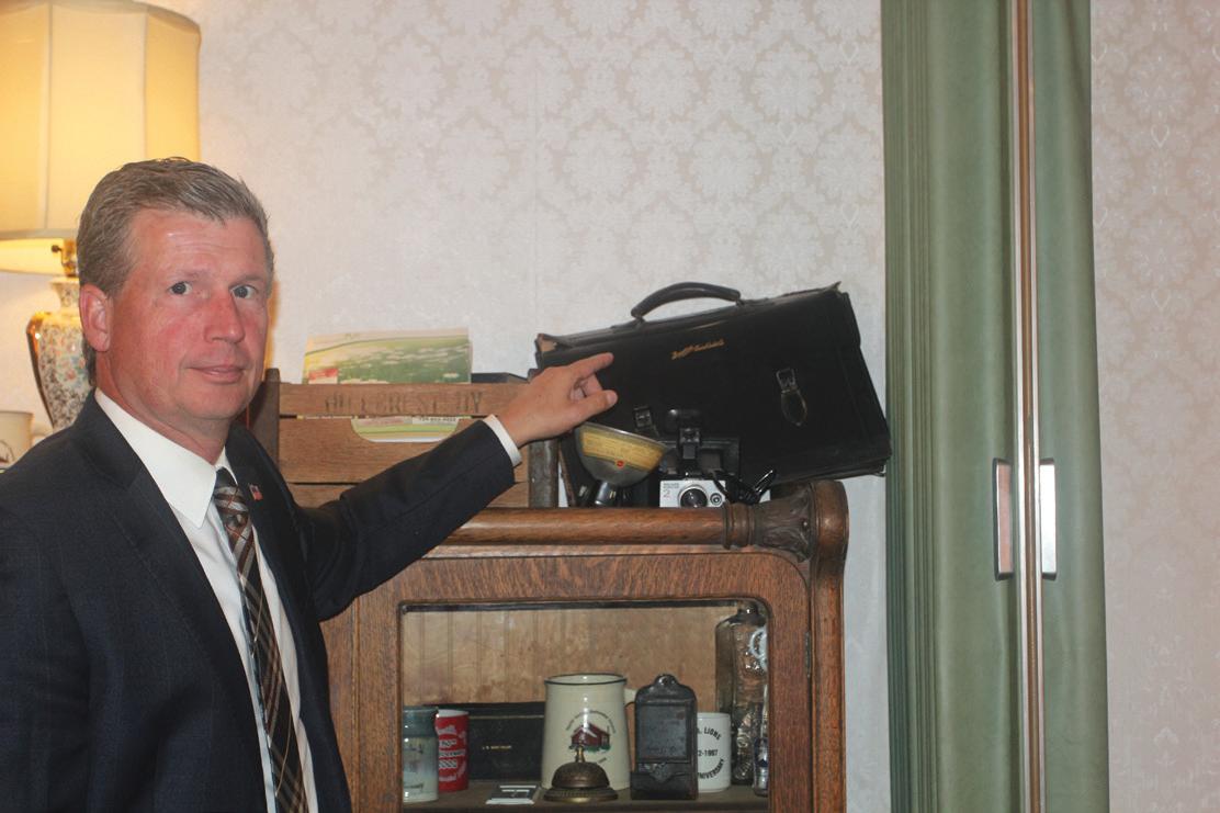 At the side of his memorabilia case, Jason Schultz is pointing to the briefcase of funeral director Jim McDonough.