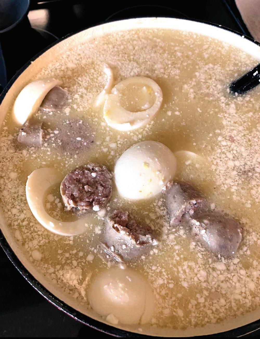 Cut kolbassi into small pieces. Slice the hard boiled eggs. Place broth over medium heat and add eggs and kolbassi also add vinegar and horseradish and salt. Mix well. Combine flour and sour cream and stir thoroughly into fat mixture. Add this to the broth and blend real well. Bring just to the boiling point and stir constantly. (Adjust eggs, horseradish, vinegar, water, flour, and sour cream depending on how much you plan to make.)