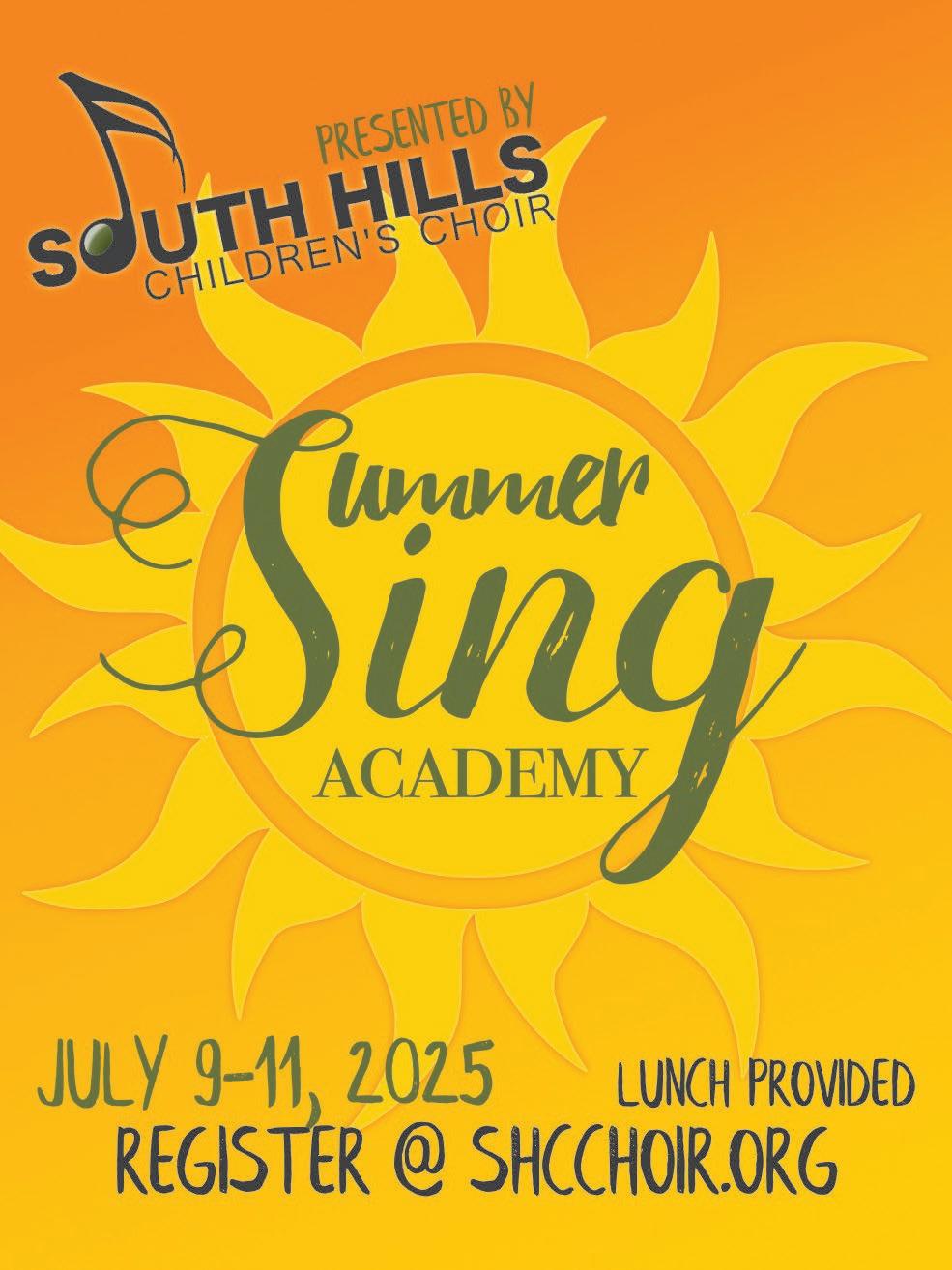 Young singers, ages 8-18, are welcome to join the three-day singing camp at View Crest Church in Eighty Four, PA. The Summer Sing Academy offers an outdoor camp experience (with lunch included) featuring classes in voice, part singing, solfege, a cappella, musical theater, and body percussion. For more details and to register, visit www.shcchoir.org.