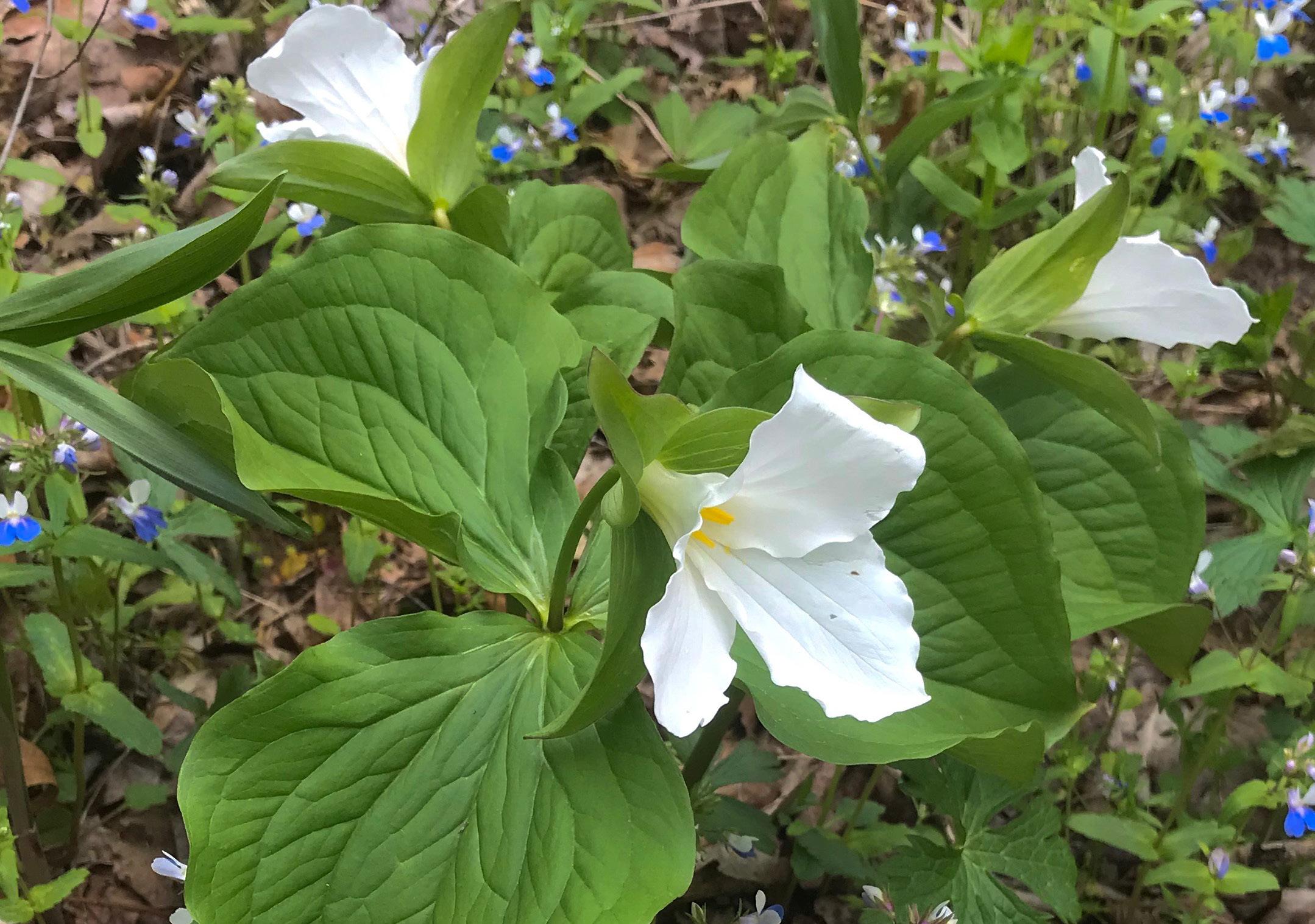 Pioneer roads followed that path, with houses and pastures in their time. Now all that remains of the Fisher farm are daffodils pushing through patches of non-native Siberian squill, above wetlands that were once cornfields. And everywhere, wildflowers — twin leaf, red, white and toad trillium, trout lily, squirrel corn, Dutchman’s breeches, Virginia blue bells, Solomon’s seal, phlox, geranium, cohosh, larkspur, Jack in the pulpit, wild ginger and acres of blue-eyed Mary, collinsia verna, the delicate signature flower of Enlow.