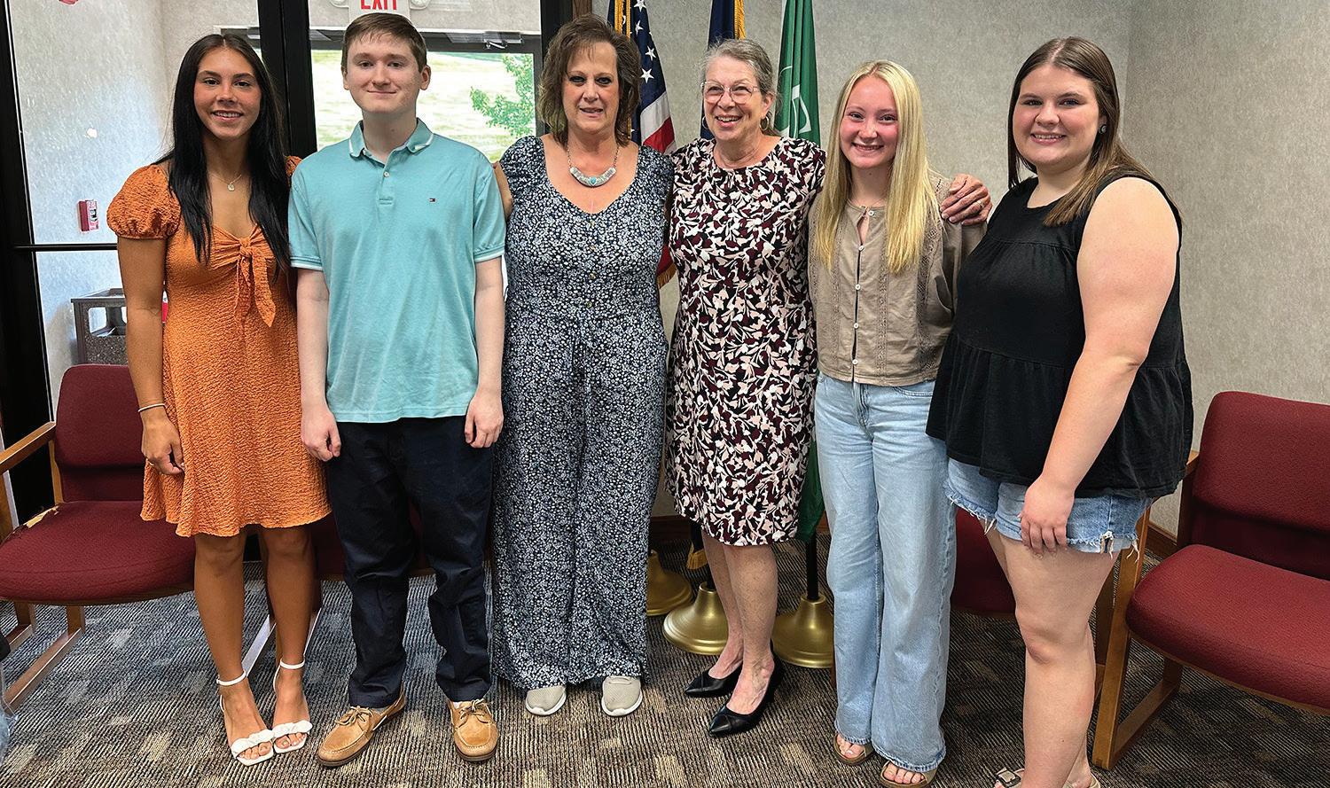 Pictured, from l. to r., are scholarship recipients Sydney Allen, Trinity High School, and Nathan Litvak, 21st Century Cyber Charter School; Nancy McCracken, First Federal of Greene County Education Club Coordinator, Taylorstown; Sandy Cerciello, Taylorstown Branch Manager; and scholarship recipients and McGuffey High School graduates Dannika White and Allee Hoover.