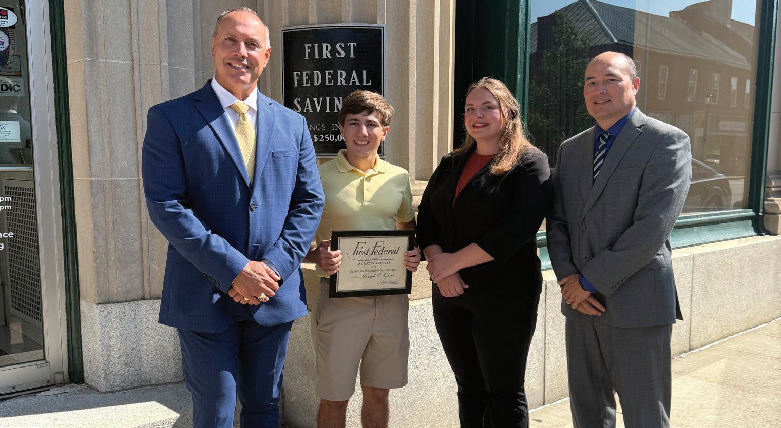 Pictured, from l. to r., are Charles W. Trump, Jr., First Federal of Greene County President/CEO; scholarship recipient and Waynesburg Central High School graduate Joe Kirsch; Noelle Johnson, First Federal of Greene County Education Club Coordinator, Waynesburg; and Terry L. Clutter, First Federal of Greene County Vice President/Treasurer. Not pictured is scholarship recipient and WCHS graduate Avery Davis.