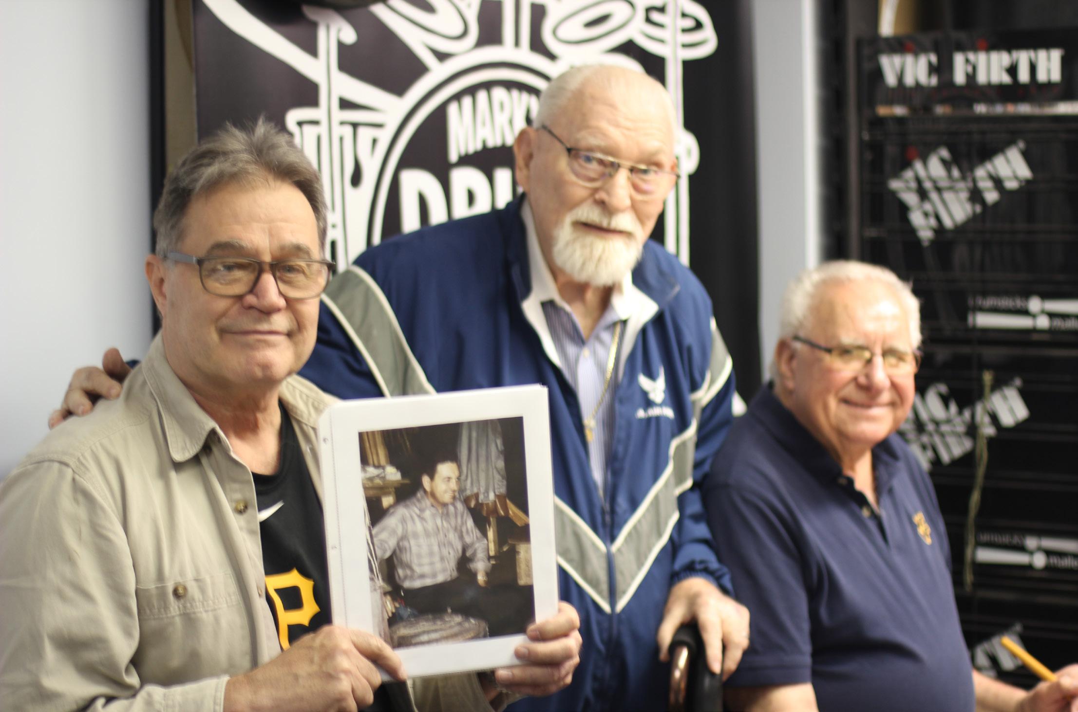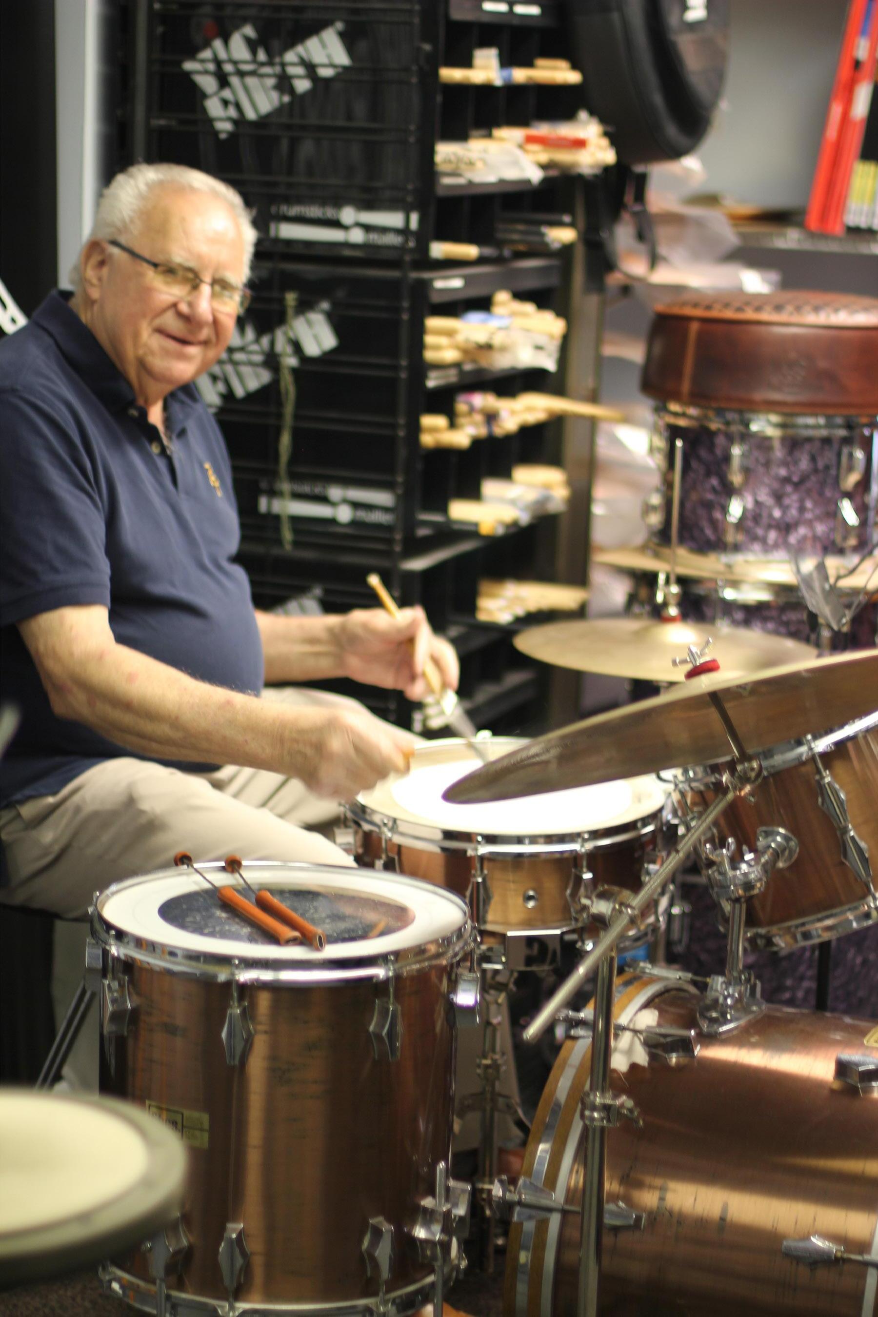 Left: Al Wrublesky playing his teacher, Bill Crockett’s, drums at Mark’s Drum Shop in Charleroi