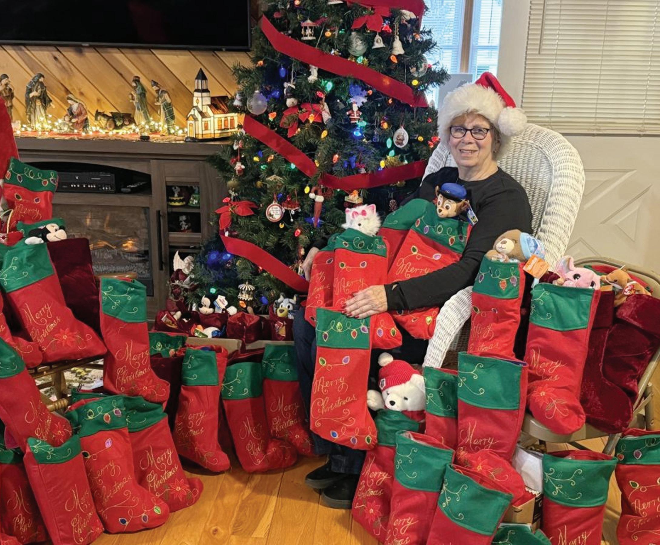 Priscella Layne with many of the 80 stuffed stockings at her 80th birthday celebration