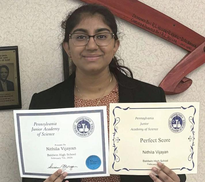junior Nithila Vijayan placed first with a perfect score at the Pennsylvania Junior Academy of Science (PJAS) Region 7 Conference held recently at Baldwin High School.