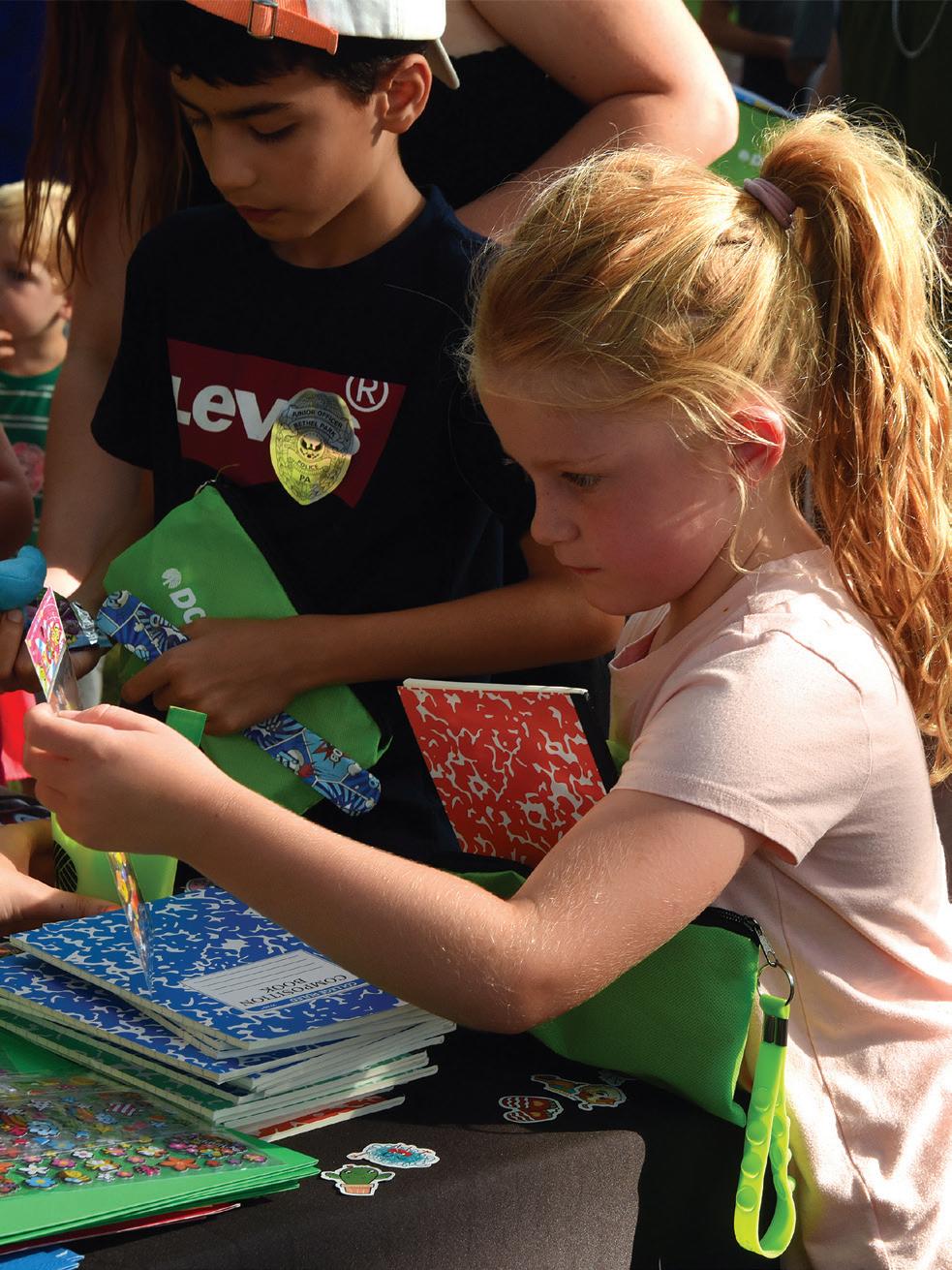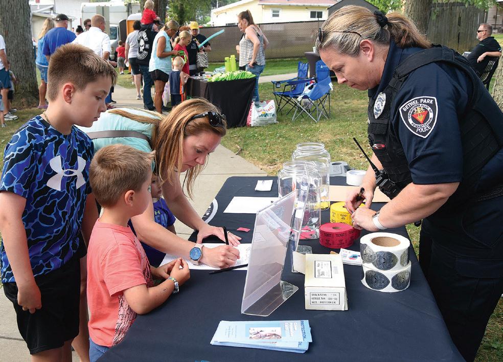 Lt. Joelle Dixon registers a family for free prizes and giveaways during National Night Out on Aug. 5 at Miners Park. SEE AQUA PAGE A2