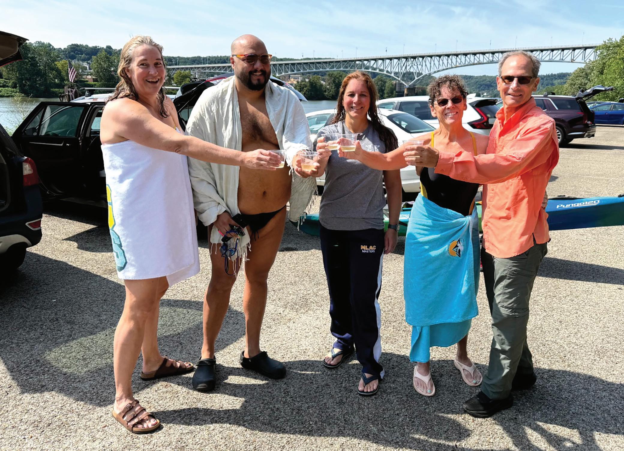 They began their five-mile swim at Duck Hollow in Homestead, traveling to the Rankin Bridge before returning to Duck Hollow. The swim was completed in a little under three hours.