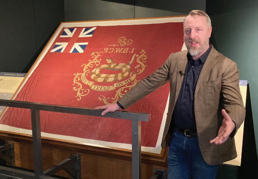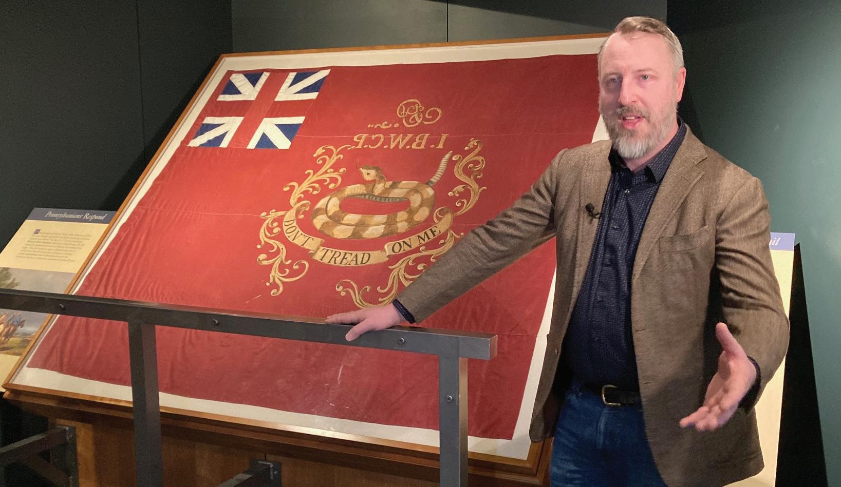 ABOVE: Mike Burke, assistant director of the museum, with a “Don’t Tread on Me” flag