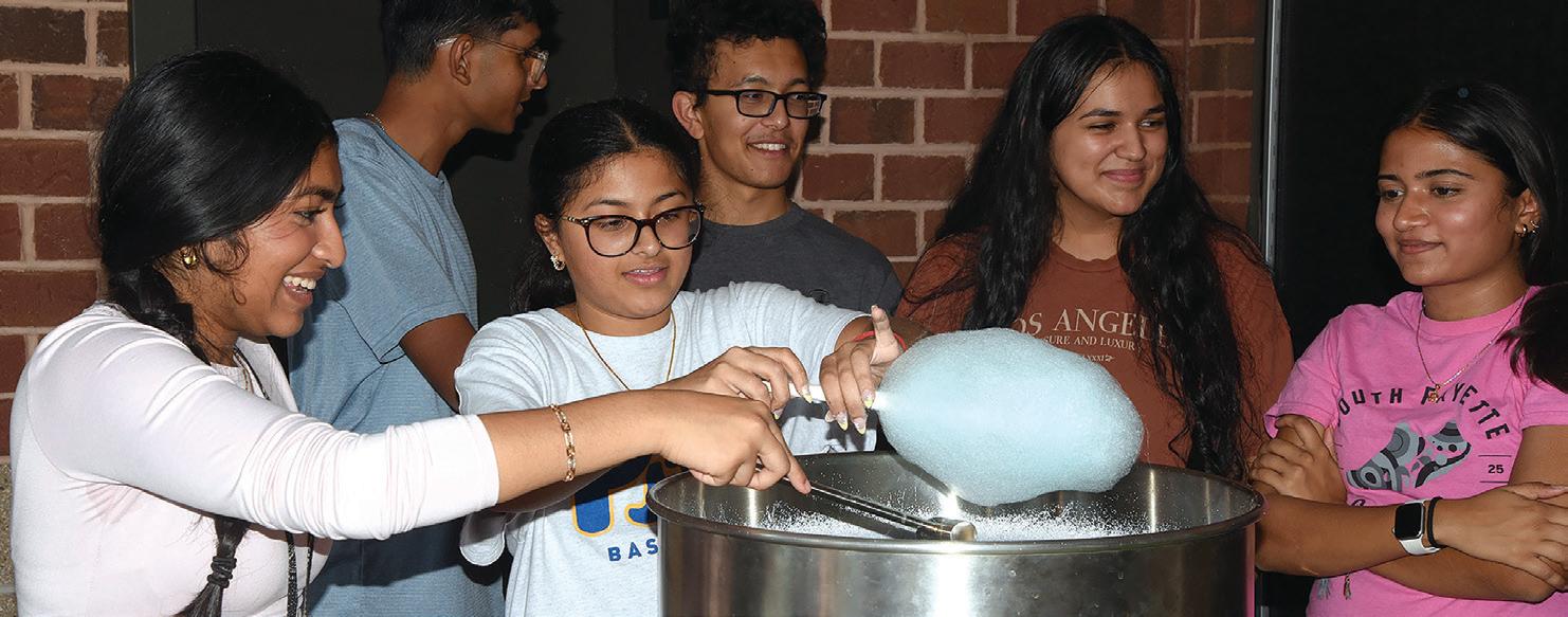 Sanika Kulkarni spins cotton candy with the help of Yaashna Praveenkumar while fellow classmates Mohit Parmar, Rohan Paranjp, Rhea Yadav and Rishi Kakadiya watch.