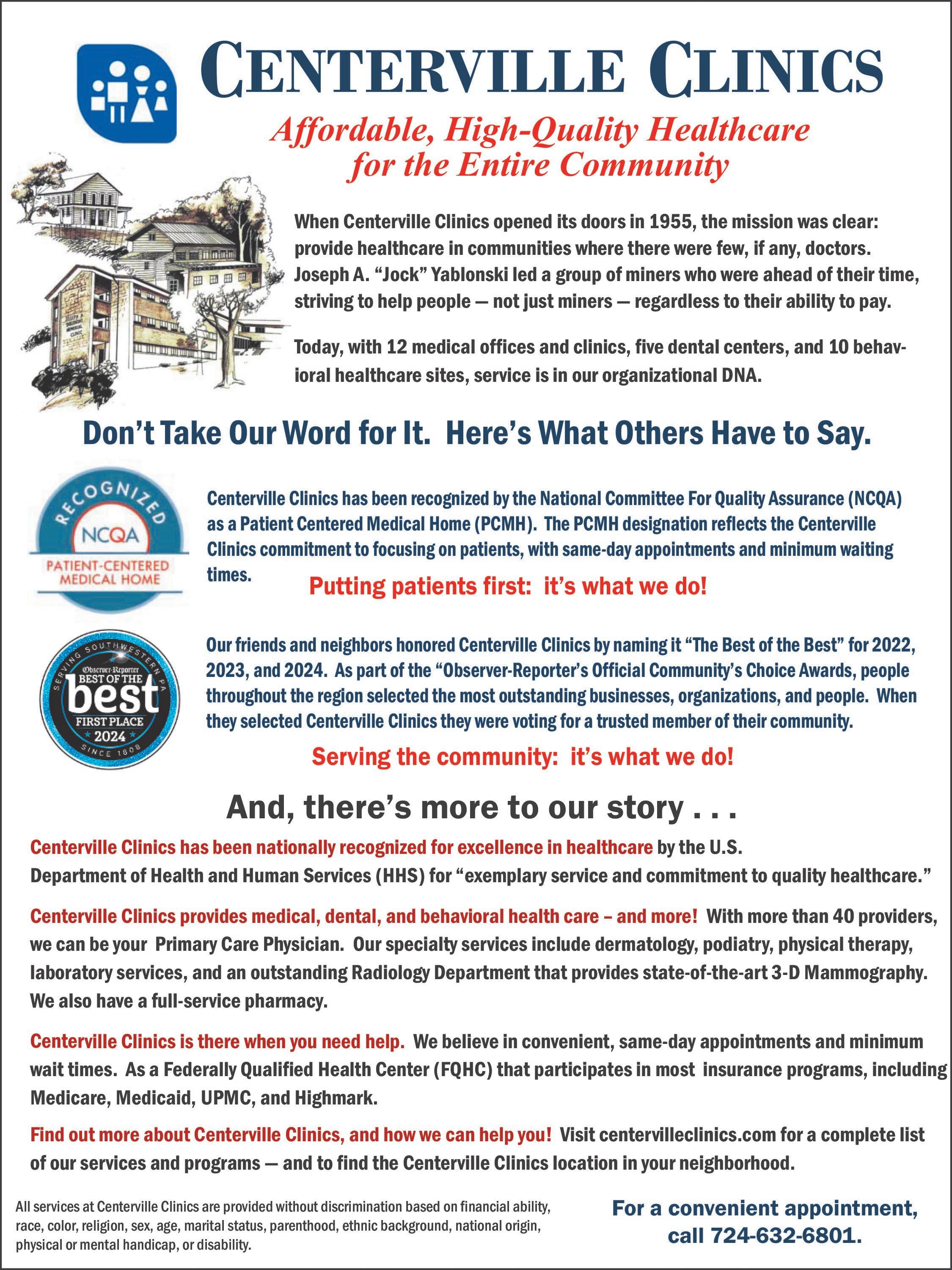 Centerville Clinics is a Federally Qualified Health Center (FQHC) that participates in most insurance programs, including Medicare, Medicaid, UPMC, and Highmark.