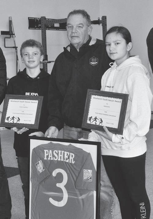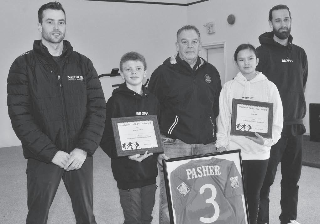 The Woolwich Youth Soccer recipients of Tyler Pasher training awards – Noah Chappell and Kiera Dick – were presented with their awards Saturday at the Nexus Health and Training location in Elmira, where they were joined by owner Luke Baleshta, Tyler’s father Geoff Pasher and David Edgar, a retired professional soccer player and operator of David Edgar Football Coaching. Steve Kannon