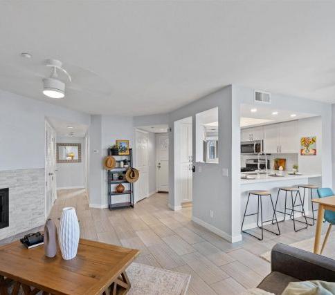 Picture perfect first floor residence in San Miguel III - Ideal open concept floorplan with private balcony boasting direct beach and pier views. Interior has been recently refreshed with numerous improvements. Kitchen area opens to family room w/ glass fireplace and drinks counter. Spacious primary suite with walk-in shower & vanity. Large secondary bedroom w/ bath. Rare: Air Conditioning added and new water heater. Elevator access from secured parking (2 Deeded Spaces) with ample guest parking. San Miguel resident amenities includes turf areas, spa(s) and gated access to North Pier Beaches. Walk outside to famed Oceanside Pier, marina and Michelin star rated restaurants.