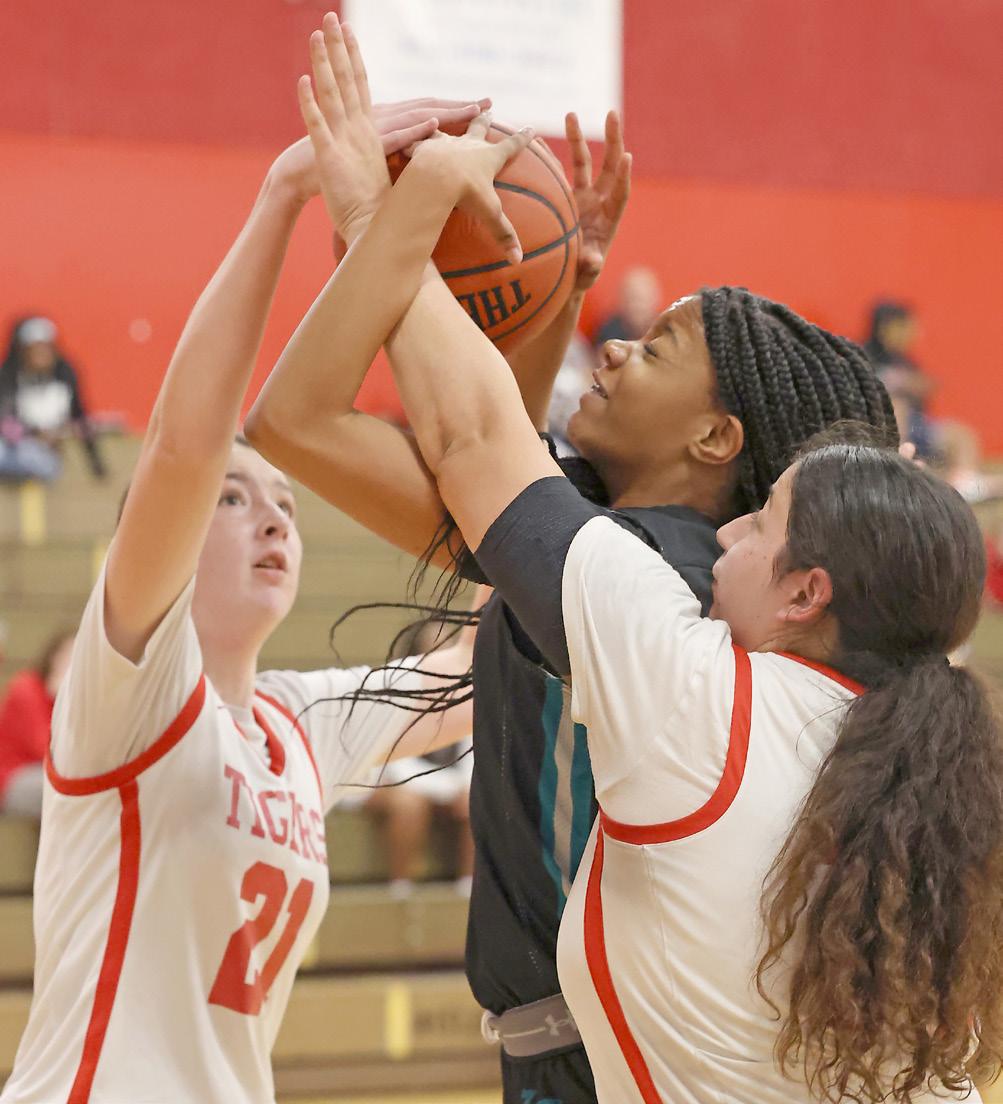 West Port’s Calise Smith (5) battles for a loose ball with Dunnellon’s Nia Heppner (21) and Jada Hayes (14).