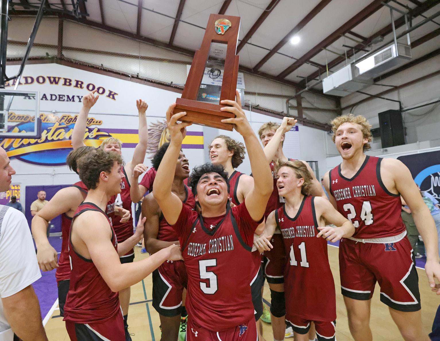 Redeemer Christian players celebrate with the District Championship trophy after defeating Oak Hall.