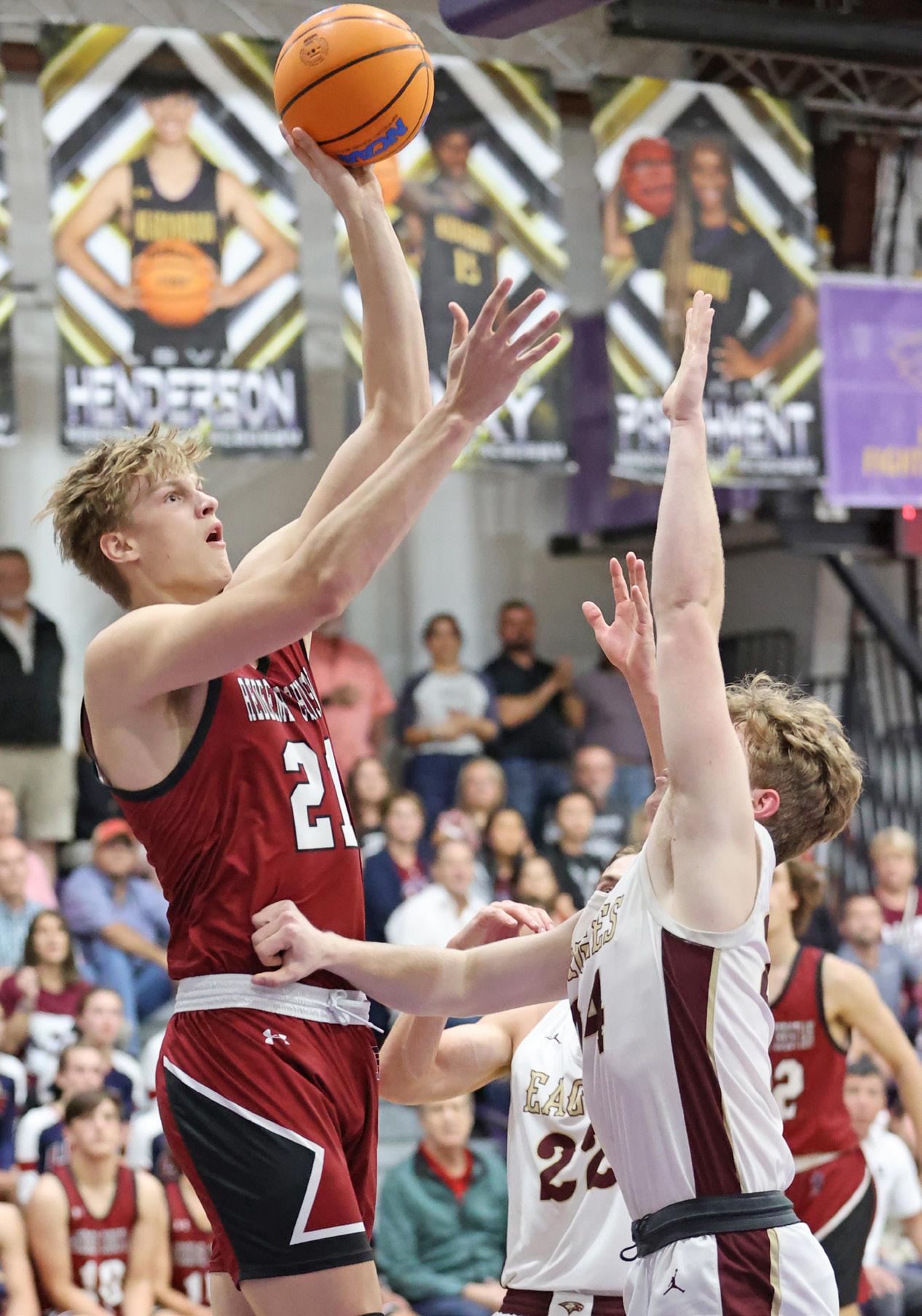 Redeemer Christian’s Jonah Harrelson (21) shoots over Oak Hall’s Gavin Jones (24).