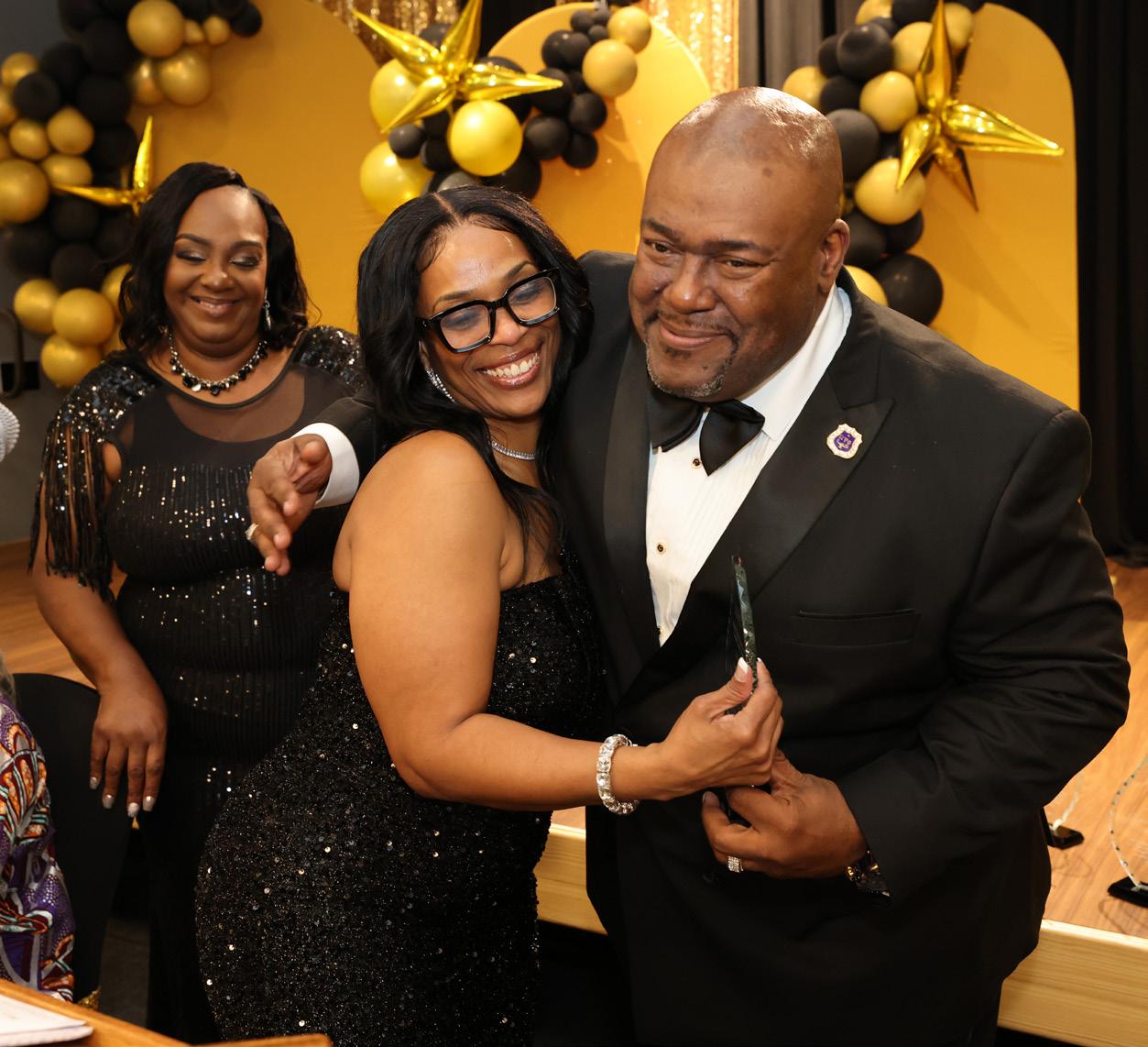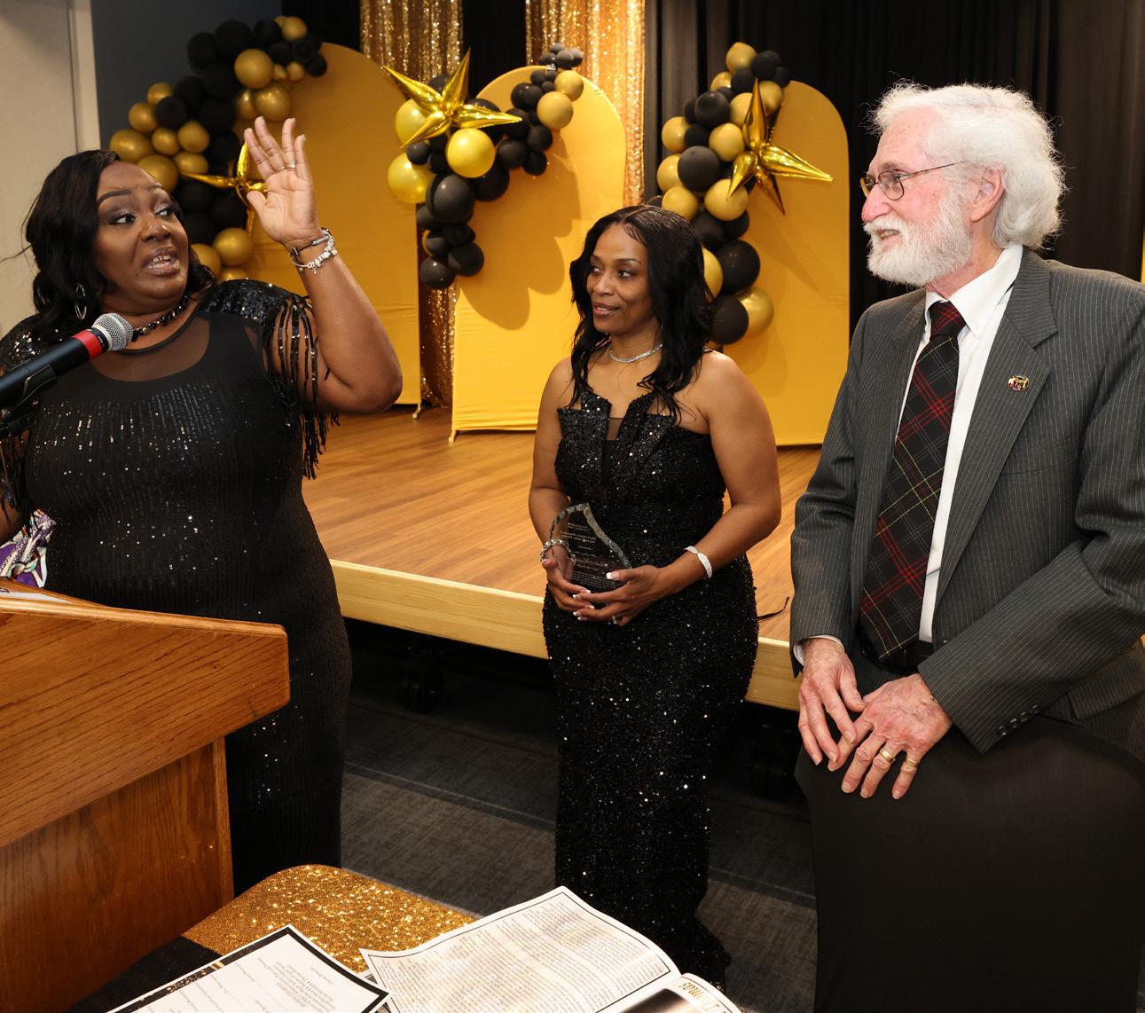 Rev. Eric Cummings, right, gets a hug from Theresa Brooks, second from right, as he receives his award as Davida Randolph, second from left, look on during the Howard Academy Community Center Black History Museum Archives Gala at the Mary Sue Rich Community Center at Reed Place in Ocala on Friday, Feb. 23, 2024.