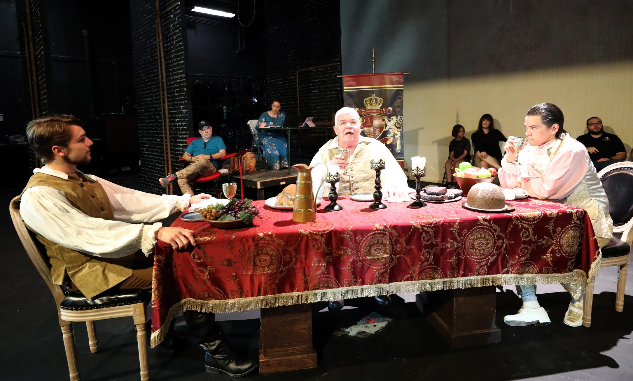 Christian Gonzales as Cuddy Banks, Janik Buranosky as Frank Thorney and Wayne Dilts as Sir Arthur Banks, left to right, rehearse a scene from “Witch” at the Ocala Civic Theatre in Ocala on Tuesday, Oct. 3, 2023.