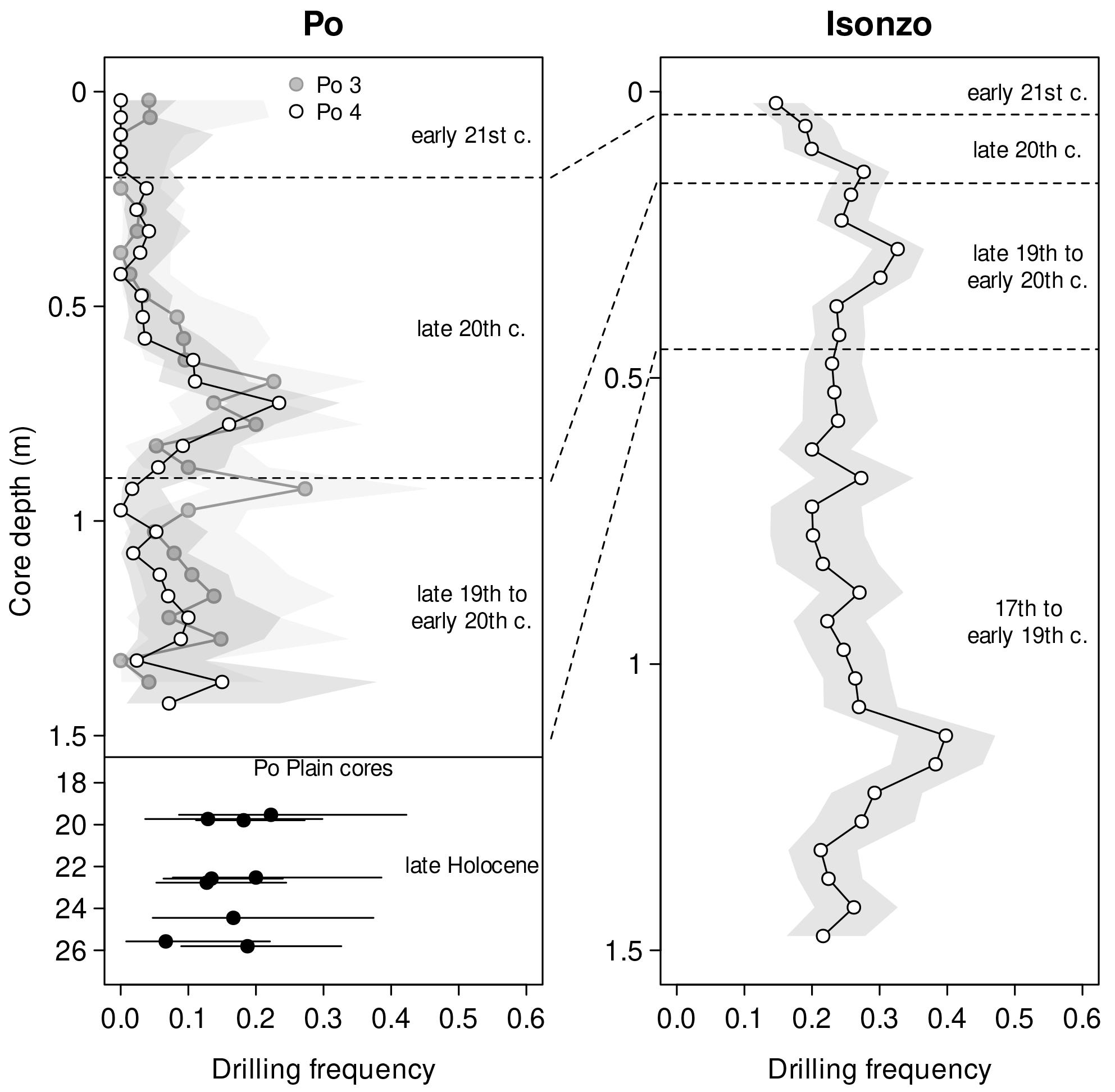 Both locations showed the same pattern. The abundance of predators and prey along with the frequency of drill holes remained consistent until the mid-19th century, when all three spiked. Zuschin says this brief window of frenetic activity is a signature from the early days of Italian industrialization.