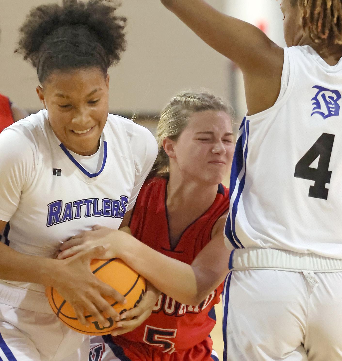 loose ball with Belleview’s Aaliyah Grant (1) during