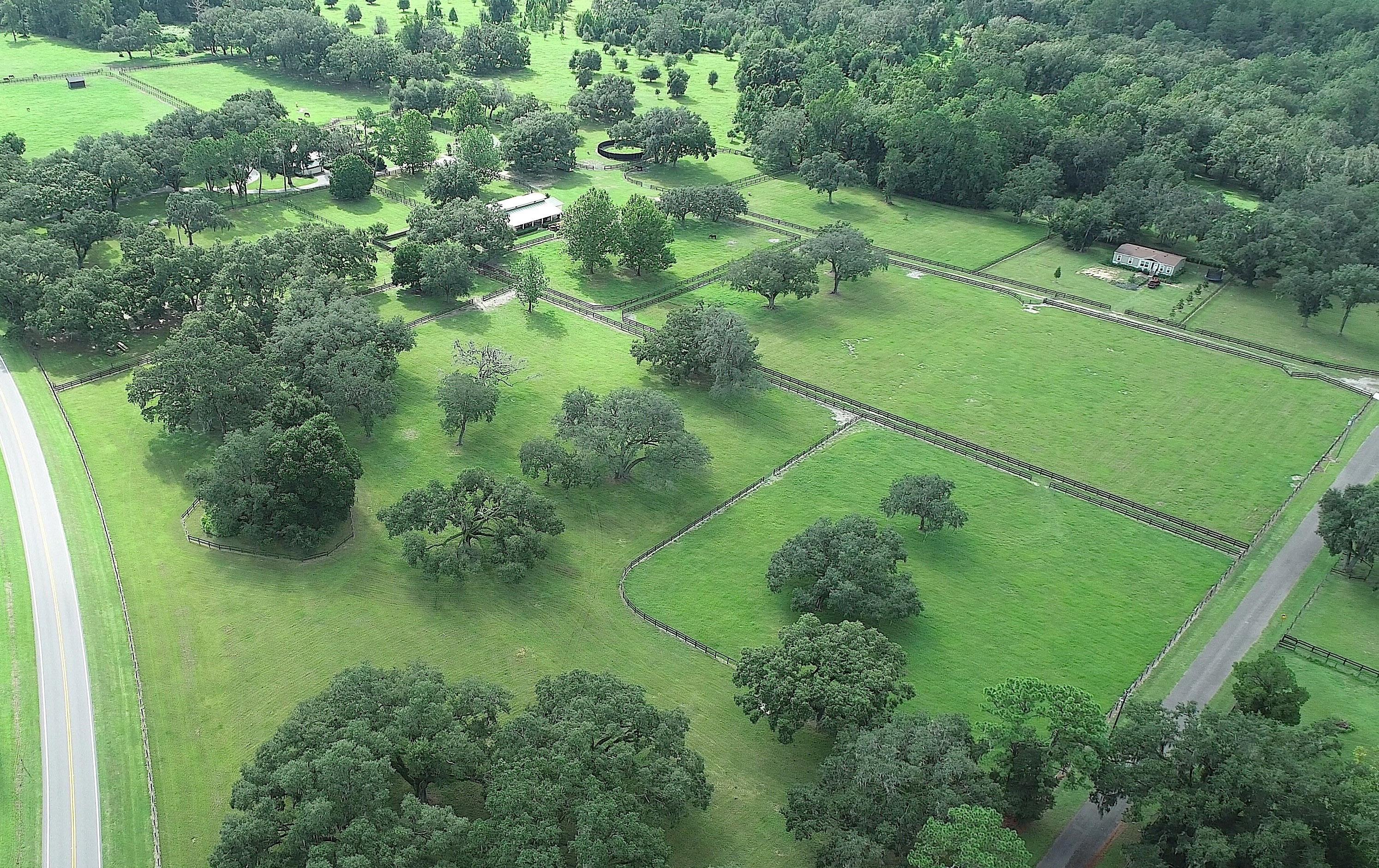 Private and desirable! Drive into the scenic northwest Ocala area and you will find beautiful country living–perfect for Thoroughbred, Quarter horse, Hunter/Jumper, Eventer, Paso Fino or cattle enthusiasts. Unique 38+/- acre property just minutes to WEC and HITS. Beautiful vistas from every view, lush pastures with impressive granddaddy oaks and mature landscaping. The 4-bedroom, 3½-bath main residence features open kitchen, spacious living room with impressive stone fireplace and built-in bookcases. The family room offers access to screen enclosed lanai and pool area, overlooking lush green pastures. Enjoy the grand owner’s bedroom, plus three more bedrooms and a private office. The equine facilities include a 12-stall stable with tack room, feed room, wash bay plus 1/1 apartment. Second story allows for hay storage. Covered parking on each side of the barn for horse trailer and other items. Large 3-bay equipment building has workshop and RV hook-up. Nice 4-bedroom, 2-bath residence for farm manager and family. The lush fields are perfect for grazing with just the right number of scattered oaks for shade and a tranquil setting.