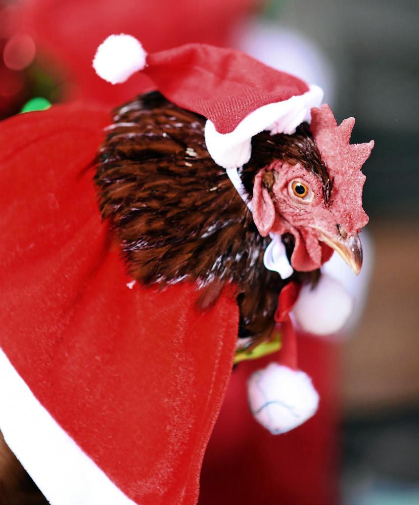 Clockwise from top right: Aspen Olmstead with Therapy Chicken; photo by Aspen Olmstead. Therapy Chicken in her Christmas best, by Shannon Jax Productions.