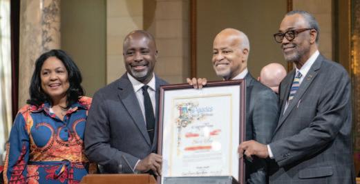 In a February 2 ceremony commemorating the start of African American Heritage Month in Los Angeles, President Harry J. Elam, Jr. was inducted into the city’s African American Hall of Fame and received the Outstanding Achievement in Higher Education Award in recognition of his work at both Occidental College and Stanford University. Above: Elam is pictured with (l-r) Councilmembers Heather Hutt, Marqueece Harris-Dawson, and Curren D. Price Left: Elam was accompanied to the event at Los Angeles City Hall by his wife, Dr. Michele Elam, right, and their daughter, Claire Patterson, left.