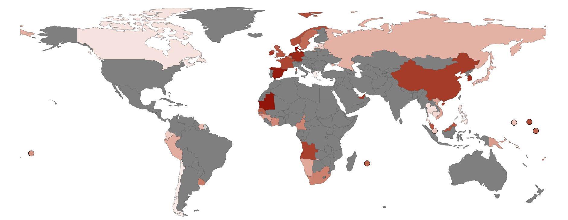 Figure 1: Global distribution of foreign vessel port activity. Countries are shaded by total foreign vessel visits to the top 100 ports. Analysis based on 2023 AIS-tracked foreign vessel visits (Hosch et al., 2025). Darker red shading indicates higher port ranks, and unshaded (grey) countries represent no available data; full methods in annex.