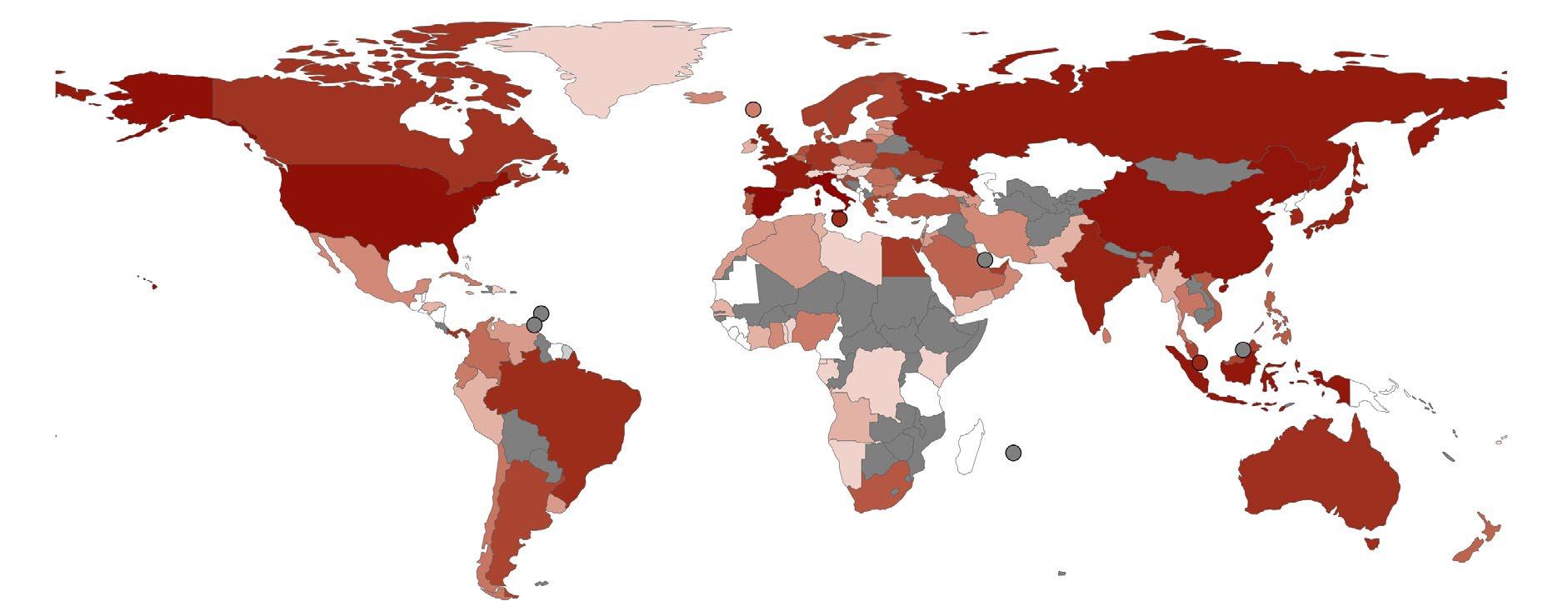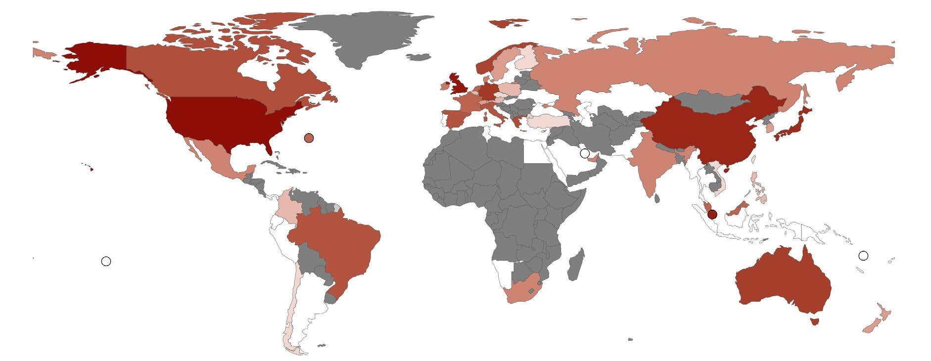 Figure 2: Global distribution of marine insurance providers based on verified office locations across countries. Mapped underwriters are drawn from Miller et al. (2016), cross-referenced with company websites. Analysis includes 44 leading providers. Darker red shading indicates higher rankings and unshaded (grey) countries represent no available data; full methods in annex.