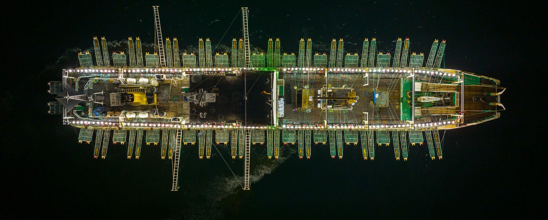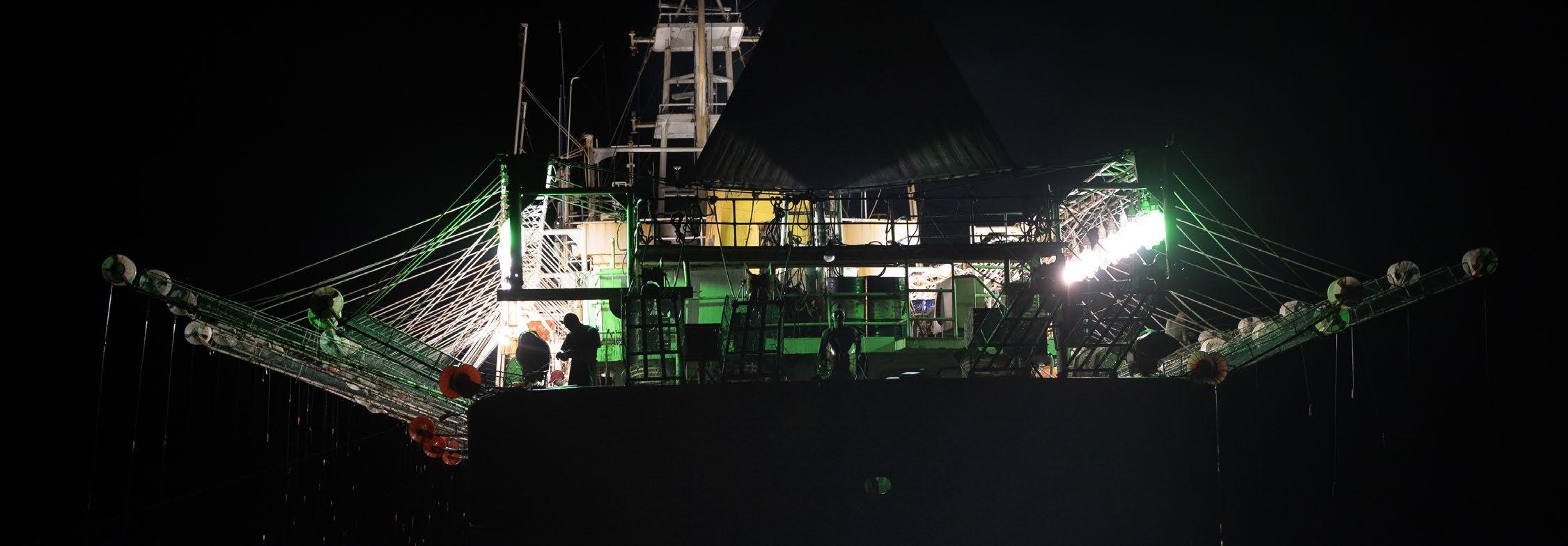A distant-water fishing vessel fishing for squid near the Galápagos Islands.