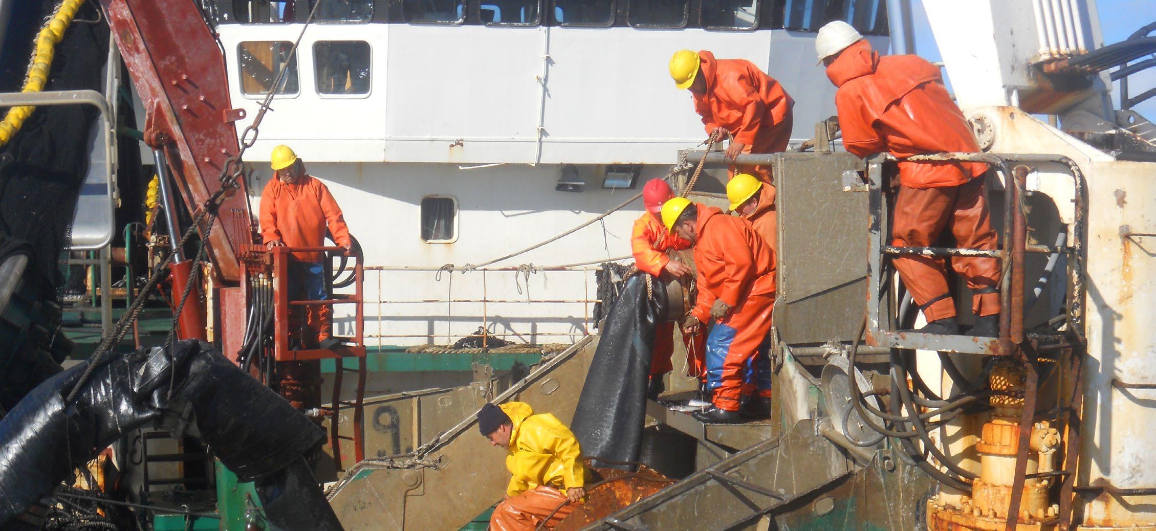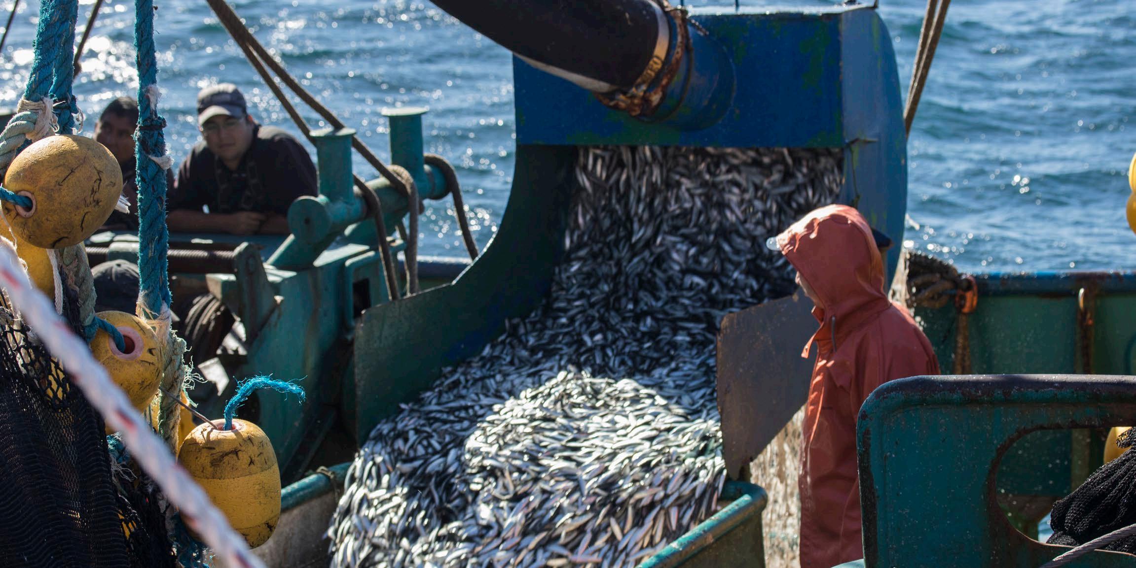 A crew processing fish aboard an industrial sardine vessel in Chile.