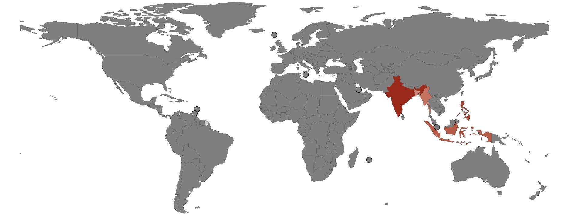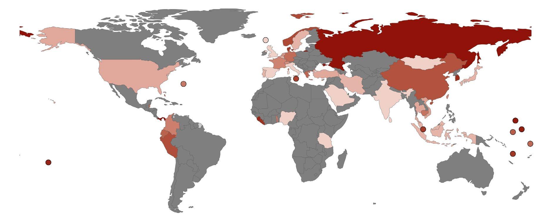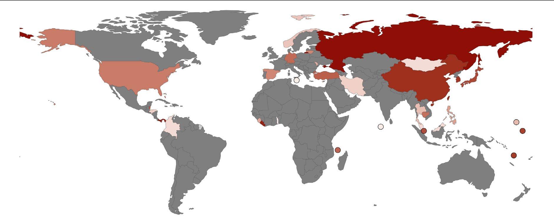 Figure 3: Global distribution of ITF-affiliated crewing agencies, based on country-level counts from the ITFShipBeSure Recruitment Agency Directory (accessed May 2024). Darker red shading indicates higher rankings and unshaded (grey) countries represent no available data; full methods in annex.