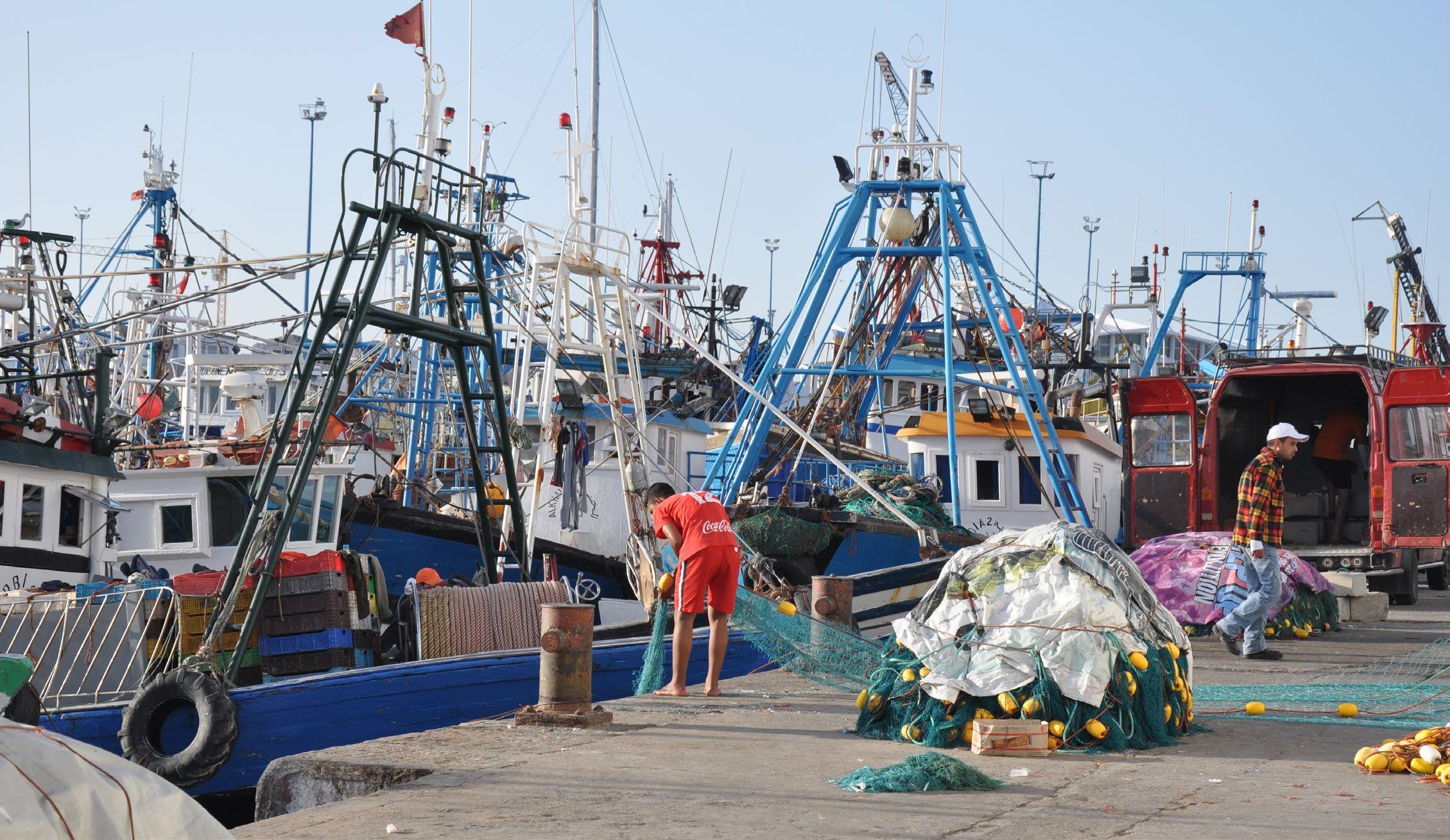 Fishers load driftnets aboard vessels at a bustling port in Morocco.