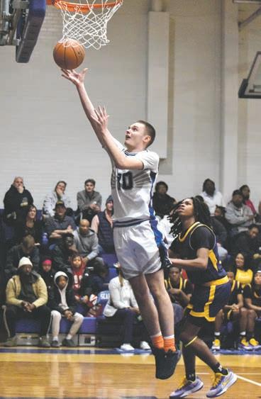 Senior forward Kayden Sharkey scores one of the four baskets he made during the game against Pocomoke.