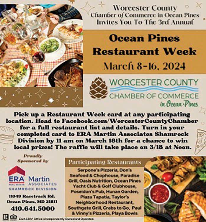 Bunting said the week is always well received, and almost every restaurant has found that it helps foster extra business during a slow season. She assures that the event is a fantastic way for patrons and eateries alike to show community support. Stamped cards can be picked up at any participating location and dropped off at the ERA Martin Office, along Racetrack Road, no later than 11 a.m. on Monday, March 18. The drawing is scheduled for the same day at noon and can be streamed live on the Worcester County Chamber of Commerce’s Facebook page.