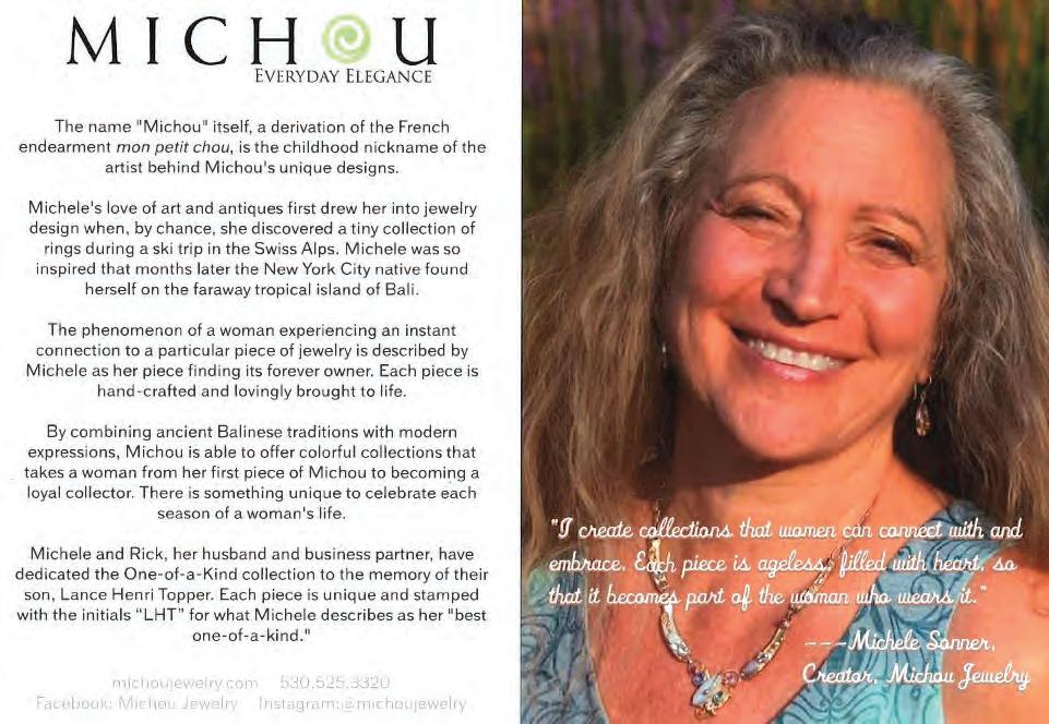 ONE DAY ONLY Saturday, April 6th • 10am-5pm Designer offering her One of Kind Pieces Don’t Miss This Event! The name “Michou” itself, a derivation of the French endearment mon petit chou, is the childhood nickname of the artist behind Michou s unique designs. Michele s love of art and antiques first drew her into jewelry design when, by chance, she discovered a tiny collection of rings during a ski trip in the Swiss Alps. Michele was so inspired that months later the New York City native found herself on the faraway tropical island of Bali. The phenomenon of a woman experiencing an instant connection to a particular piece of jewelry is described by Michele as her piece finding its forever owner. Each piece is hand-crafted and lovingly brought to life. By combining ancient Balinese traditions with modern expressions, Michou is able to offer colorful collections that takes a woman from her first piece of Michou to becoming a loyal collector. There is something unique to celebrate each season of woman s life. Michele and Rick, her husband and business partner, have dedicated the One-of -a Kind collection to the memory of their son, Lance Henri Topper. Each piece is unique and stamped with the initials “LHT” for what Michele describes as her “best one-of-a-kind.” “I create collections that women can connect with and embrace. Each piece is ageless filled with heart, so that it becomes part of the woman who wears it.” Michele Sonner, Creator, Michou Jewelry