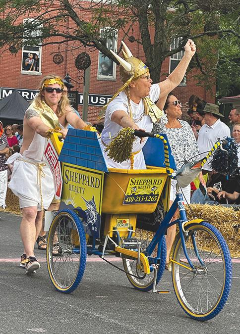 The mother-son Sheppard Realty team of Gussie Sholtis and Kyle Hill hammed it up with their chariot-inspired costumes.